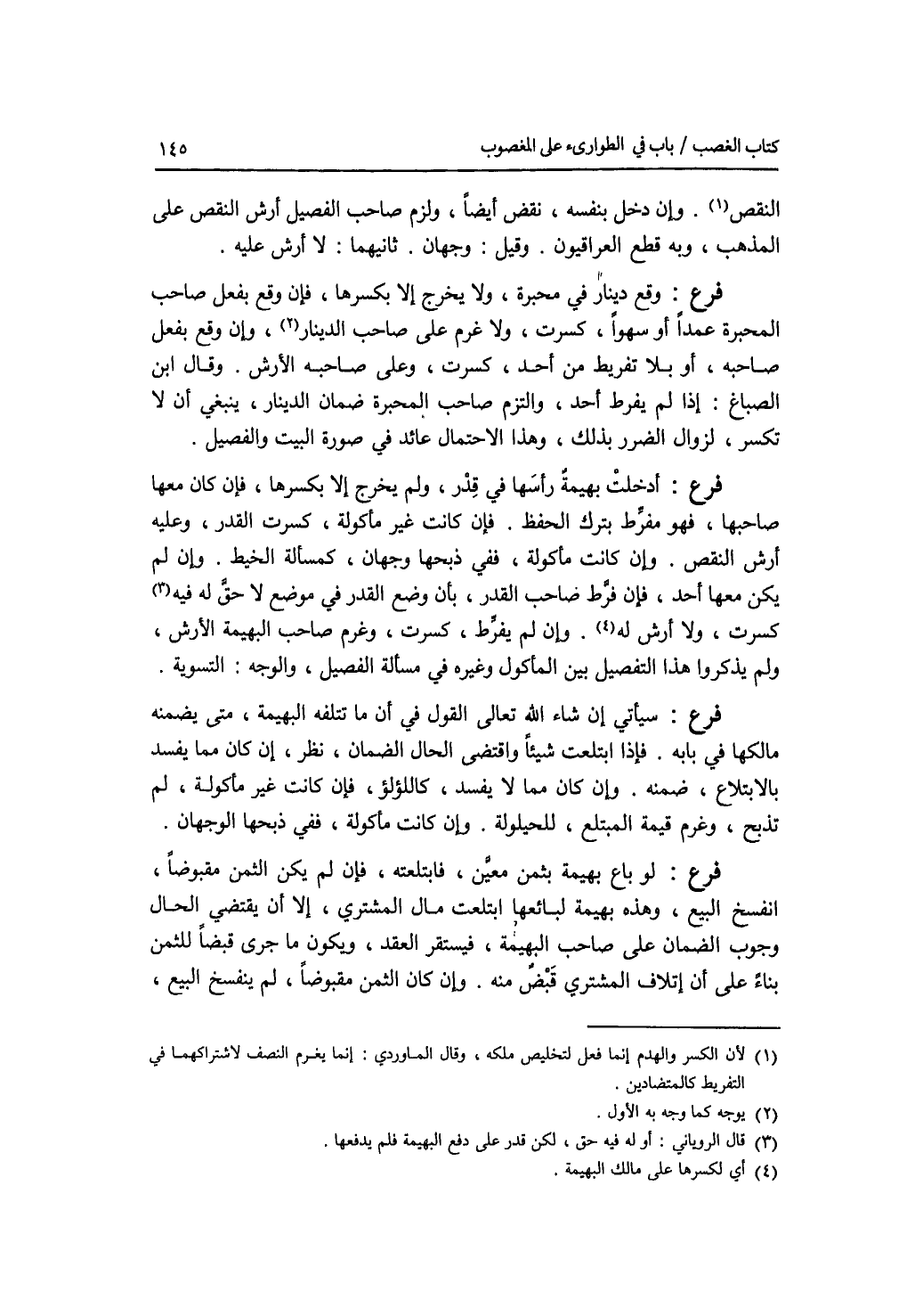 النقص. وإن دخل بنفسه، نقض أيضا، ولزم صاحب الفصيل أرش النقص على المذهب، وبه قطع العراقيون. وقيل: وجهان. ثانيهما: لا أرش عليه. فرع وقع دينار في محبرة، ولا يخرج إلا بكسرها، فإن وقع بفعل صاحب المحبرة عمدا أو سهوا، كسرت، ولا غرم على صاحب الدينار، وإن وقع بفعل صاحبه، أو بلا تفريط من أحد، كسرت، وعلى صاحبه الارش. وقال ابن الصباغ: إذا لم يفرط أحد، والتزم صاحب المحبرة ضمان الدينار، ينبغي أن لا تكسر، لزوال الضرر بذلك، وهذا الاحتمال عائد في صورة البيت والفصيل. فرع أدخلت بهيمة رأسها في قدر، ولم يخرج إلا بكسرها، فإن كان معها صاحبها، فهو مفرط بترك الحفظ. فإن كانت غير مأكولة، كسرت القدر، وعليه أرش النقص. وإن كانت مأكولة، ففي ذبحها وجهان، كمسألة الخيط. وإن لم يكن معها أحد، فإن فرط صاحب القدر، بأن وضع القدر في موضع لا حق له فيه، كسرت، ولا أرش له. وإن لم يفرط، كسرت، وغرم صاحب البهيمة الارش، ولم يذكروا هذا التفصيل بين المأكول وغيره في مسألة الفصيل، والوجه: التسوية. فرع سيأتي إن شاء الله تعالى القول في أن ما تتلفه البهيمة، متى يضمنه مالكها في بابه. فإذا ابتلعت شيئا واقتضى الحال الضمان، نظر، إن كان مما يفسد بالابتلاع، ضمنه. وإن كان مما لا يفسد، كاللؤلؤ، فإن كانت غير مأكولة، لم تذبح، وغرم قيمة المبتلع، للحيلولة. وإن كانت مأكولة، ففي ذبحها الوجهان. فرع لو باع بهيمة بثمن معين، فابتلعته، فإن لم يكن الثمن مقبوضا، انفسخ البيع، وهذه بهيمة لبائعها ابتلعت مال المشتري، إلا أن يقتضي الحال وجوب الضمان على صاحب البهيمة، فيستقر العقد، ويكون ما جرى قبضا للثمن بناء على أن إتلاف المشتري قبض منه. وإن كان الثمن مقبوضا، لم ينفسخ البيع،