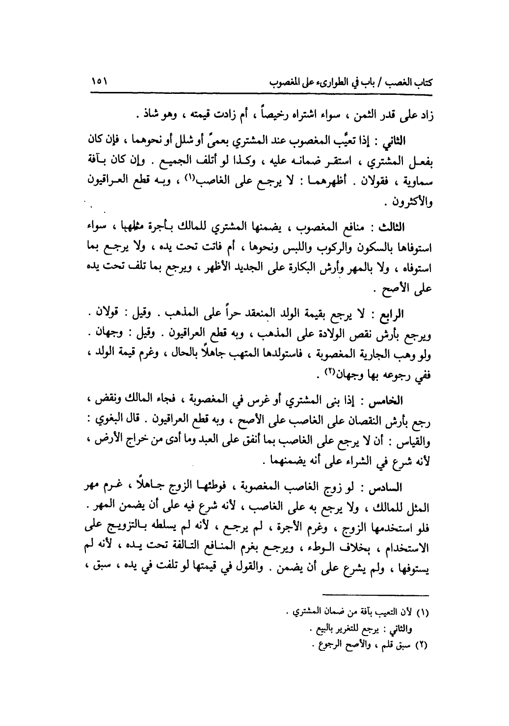 زاد على قدر الثمن، سواء اشتراه رخيصا، أم زادت قيمته، وهو شاذ. الثاني: إذا تعيب المغصوب عند المشتري بمعى أو شلل أو نحوهما، فإن كان بفعل المشتري، استقر ضمانه عليه، وكذا لو أتلف الجميع. وإن كان بآفة سماوية، فقولان. أظهرهما: لا يرجع على الغاصب، وبه قطع العراقيون والاكثرون. الثالث: منافع المغصوب، يضمنها المشتري للمالك بأجرة مثلها، سواء استوفاها بالسكون والركوب واللبس ونحوها، أم فاتت تحت يده، ولا يرجع بما استوفاه، ولا بالمهر وأرش البكارة على الجديد الاظهر، ويرجع بما تلف تحت يده على الاصح. الرابع: لا يرجع بقيمة الولد المنعقد حرا على المذهب. وقيل: قو لان. ويرجع بأرش نقص الولادة على المذهب، وبه قطع العراقيون. وقيل: وجهان. ولو وهب الجارية المغصوبة، فاستولدها المتهب جاهلا بالحال، وغرم قيمة الولد، ففي رجوعه بها وجهان. الخامس: إذا بنى المشتري أو غرس في المغصوبة، فجاء المالك ونقض، رجع بأرش النقصان على الغاصب على الاصح، وبه قطع العراقيون. قال البغوي: والقياس: أن لا يرجع على الغاصب بما انفق على العبد وما أدى من خراج الارض، لانه شرع في الشراء على أنه يضمنهما. السادس: لو زوج الغاصب المغصوبة، فوطئها الزوج جاهلا، غرم مهر المثل للمالك، ولا يرجع به على الغاصب، لانه شرع فيه على أن يضمن المهر. فلو استخدمها الزوج، وغرم الاجرة، لم يرجع لانه لم يسلطه بالتزويج على الاستخدام، بخلاف الوطئ، ويرجع بغرم المنافع التالفة تحت يده، لانه لم يستوفها، ولم يشرع على أن يضمن. والقول في قيمتها لو تلفت في يده، سبق،