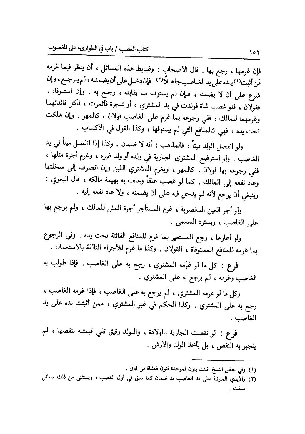 فإن غرمها، رجع بها. قال الاصحاب: وضابط هذه المسائل، أن ينظر فيما غرمه من أثبت يده على (يد) الغاصب جاهلا. فإن دخل على أن يضمنه، لم يرجع، وأن شرع على أن لا يضمنه، فإن لم يستوف ما يقابله، رجع به. وإن استوفاه، فقولان. فلو غصب شاة فولدت في يد المشتري، أو شجرة فأثمرت، فأكل فائدتهما وغرمهما للمالك، ففي رجوعه بما غرم على الغاصب قولان، كالمهر. وإن هلكت تحت يده، فهي كالمنافع التي لم يستوفها، وكذا القول في الاكساب. ولو انفصل الولد ميتا، فالمذهب: أنه لا ضمان، وكذا إذا انفصل ميتا في يد الغاصب. ولو استرضع المشتري الجارية في ولده أو ولد غيره، وغرم أجرة مثلها، ففي رجوعه بها قولان، كالمهر، ويغرم المشتري اللبن وإن انصرف إلى سخلتها وعاد نفعه إلى المالك، كما لو غصب علفا وعلف به بهيمة مالكه، قال البغوي: وينبغي أن يرجع لانه لم يدخل فيه على أن يضمنه، ولا عاد نفعه إليه. ولو أجر العين المغصوبة، غرم المستأجر أجرة المثل للمالك، ولم يرجع بها على الغاصب، ويسترد المسمى. ولو أعارها، رجع المستعير بما غرم للمنافع الفائتة تحت يده. وفي الرجوع بما غرمه للمنافع المستوفاة، القولان. وكذا ما غرم للاجزاء التالفة بالاستعمال. فرع كل ما لو غرمه المشتري رجع به على الغاصب. فإذا طولب به الغاصب وغرمه، لم يرجع به على المشتري، وكل ما (لو) غرمه المشتري، لم يرجع به على الغاصب، فإذا غرمه الغاصب، رجع به على المشتري، وكذا الحكم في غير المشتري ممن أثبتت يده على يد الغاصب. فرع لو نقصت الجارية بالولادة، والولد رقيق تفي قيمته بنقصها، لم ينجبر به النقص، بل يأخذ الولد والارش.