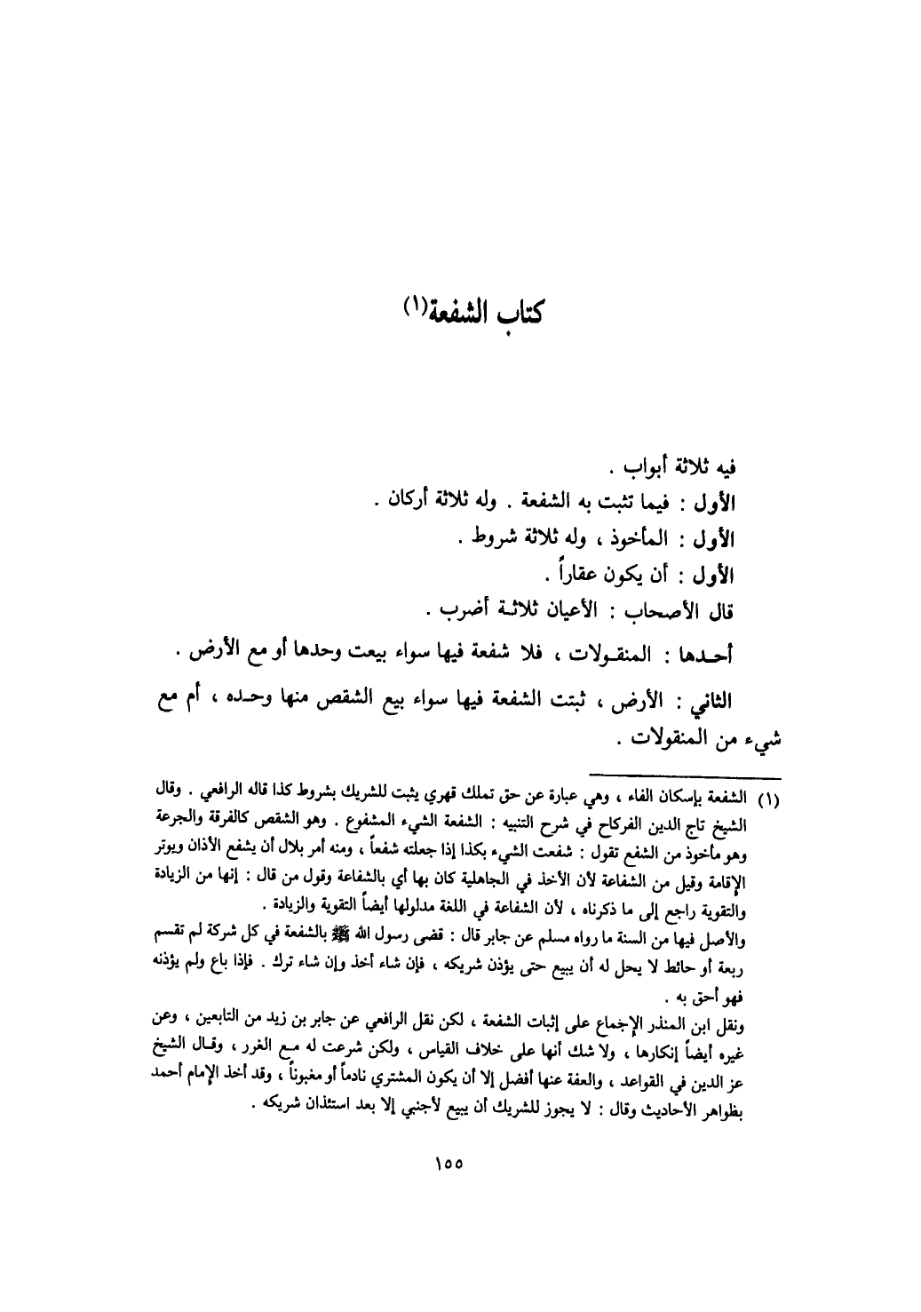 الأول : أن يكون عقارا قال الاصحاب: الاعيان ثلاثة أضرب. أحدها: المنقولات، فلا شفعة فيها سواء بيعت وحدها أو مع الارض. الثاني: الارض، ثبتت الشفعة فيها سواء بيع الشقص منها وحده، أم مع شئ من المنقولات.