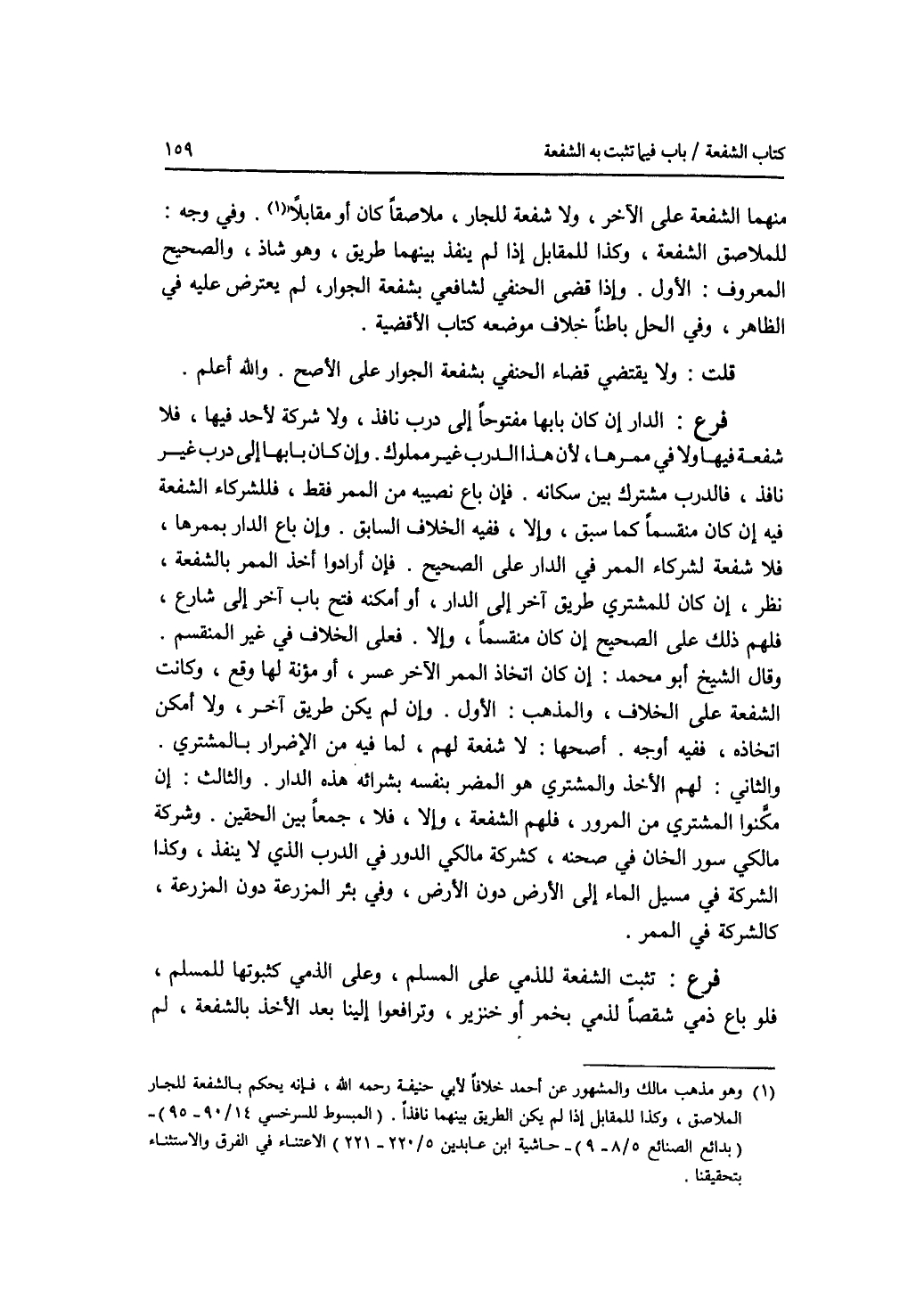 منهما الشفعة على الآخر، ولا شفعة للجار، ملاصقا كان أو مقابلا. وفي وجه: للملاصق الشفعة، وكذا للمقابل إذا لم ينفذ بينهما طريق، وهو شاذ، والصحيح المعروف: الاول. وإذا قضى الحنفي لشافعي بشفعة الجوار، لم يعترض عليه في الظاهر، وفي الحل باطنا خلاف موضعه كتاب الاقضية. قلت: ولا يقتضي قضاء الحنفي بشفعة الجوار على الاصح. والله أعلم فرع الدار إن كان بابها مفتوحا إلى درب نافذ، ولا شركة لاحد فيها، فلا شفعة فيها ولا في ممرها، لان هذا الدرب غير مملوك. وإن كان بابها إلى درب غير نافذ، فالدرب مشترك بين سكانه. فان باع نصيبه من الممر فقط، فللشركاء الشفعة فيه إن كان منقسما كما سبق، وإلا، ففيه الخلاف السابق. وإن باع الدار بممرها، فلا شفعة لشركاء الممر في الدار على الصحيح. فان أرادوا أخذ الممر با لشفعة، نظر، إن كان للمشتري طريق آخر إلى الدار، أو أمكنه فتح باب آخر إلى شارع، فلهم ذلك على الصحيح إن كان منقسما، وإلا. فعلى الخلاف في غير المنقسم. وقال الشيخ أبو محمد: إن كان في اتخاذ الممر الآخر عسر، أو مؤنة لها وقع، وكانت الشفعة على الخلاف، والمذهب: الاول. وإن لم يكن طريق آخر، ولا أمكن اتخاذه، ففيه أوجه. أصحها: لا شفعة لهم، لما فيه من الاضرار بالمشتري. والثاني: لهم الاخذ والمشتري هو المضر بنفسه بشرائه هذه الدار. والثالث: إن مكنوا المشتري من المرور، فلهم الشفعة، وإلا، فلا، جمعا بين الحقين. وشركة مالكي سور الخان في صحنه، كشركة مالكي الدور في الدرب الذي لا ينفذ، وكذا الشركة في مسيل الماء إلى الارض دون الارض، وفي بئر المزرعة دون المزرعة، كالشركة في الممر. فرع تثبت الشفعة للذمي على المسلم، وعلى الذمي كثبوتها للمسلم، فلو باع ذمي شقصا لذمي بخمر أو خنزير، وترافعوا إلينا بعد الاخذ بالشفعة، لم