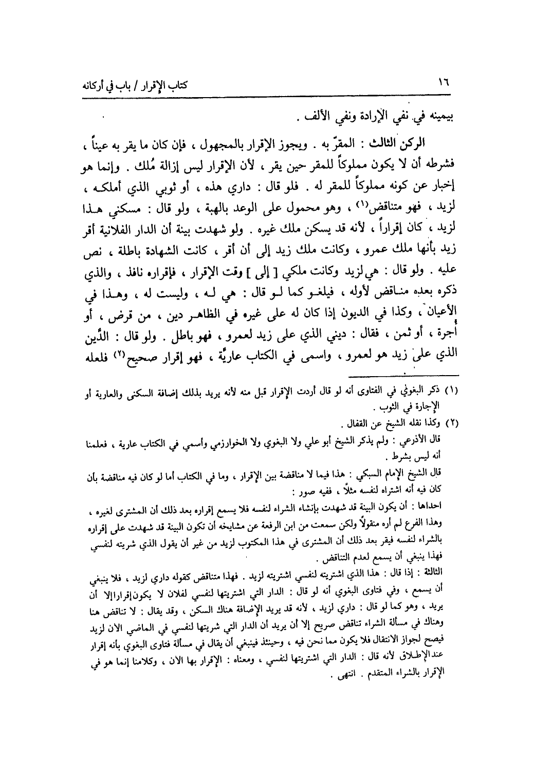 الركن الثالث : المقر به. ويجوز الاقرار بالمجهول، فإن كان ما يقر به عينا، فشرطه أن لا يكون مملوكا للمقر حين يقر، لان الاقرار ليس إزالة ملك، وإنما هو إخبار عن كونه مملوكا للمقر له. فلو قال: داري هذه، أو ثوبي الذي أملكه، لزيد، فهو متناقض، وهو محمول على الوعد بالهبة، ولو قال: مسكني هذا لزيد، كان إقرارا، لانه قد يسكن ملك غيره. ولو شهدت بينة أن الدار الفلانية أقر زيد بأنها ملك عمرو، وكانت ملك زيد إلى أن أقر، كانت الشهادة باطلة، نص عليه. ولو قال: هي لزيد وكانت ملكي (إلى) وقت الاقرار، فاقراره نافذ. والذي ذكره بعده مناقض لاوله، فيلغو كما لو قال: هي له، وليست له، وهذا في الاعيان، وكذا في الديون إذا كان له على غيره في الظاهر دين، من قرض، أو أجرة، أو ثمن، فقال: ديني الذي على زيد لعمرو، فهو باطل. ولو قال: الدين الذي على زيد هو لعمرو، واسمي في الكتاب عارية، فهو إقرار صحيح، فلعله