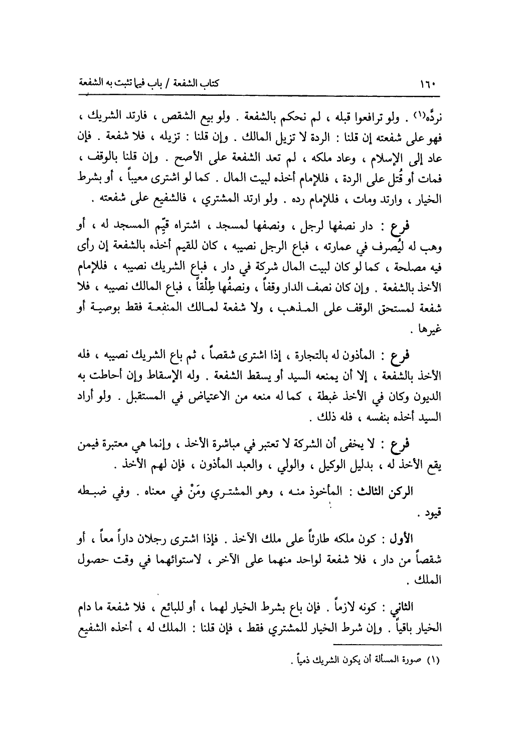 نرده. ولو ترافعوا قبله، لم نحكم بالشفعة. ولو بيع الشقص، فارتد الشريك، فهو على شفعته إن قلنا: الردة لا تزيل المالك. وإن قلنا: تزيله، فلا شفعة. فإن عاد إلى الاسلام، وعاد ملكه، لم تعد الشفعة على الاصح. وإن قلنا بالوقف، فمات أو قتل على الردة، أخذه لبيت المال. كما لو اشترى معيبا، أو بشرط الخيار، وأرتد ومات، فللامام رده. ولو ارتد المشتري، فالشفيع على شفعته. فرع دار نصفها لرجل، ونصفها لمسجد، اشتراه قيم المسجد له، أو وهب له ليصرف في عمارته، فباع الرجل نصيبه، كان للقيم أخذه بالشفعة إن رأى فيه مصلحة، كما لو كان لبيت المال شركة في دار، فباع الشريك نصيبه، فللامام الاخذ بالشفعة. وإن كان نصف الدار وقفا، ونصفها طلقا، فباع المالك نصيبه، فلا شفعة لمستحق الوقف على المذهب، ولا شفعة لمالك المنفعة فقط بوصية أو غيرها. فرع المأذون له بالتجارة، إذا اشترى شقصا، ثم باع الشريك نصيبه، فله الاخذ بالشفعة، إلا أن يمنعه السيد أو يسقط الشفعة. وله الاسقاط وإن أحاطت به الديون وكان في الاخذ غبطة، كما له منعه من الاعتياض في المستقبل. ولو أراد السيد أخذه بنفسه، فله ذلك. فرع لا يخفى أن الشركة لا تعتبر في مباشرة الاخذ، وإنما هي معتبرة فيمن يقع الاخذ له، بدليل الوكيل، والولي، والعبد المأذون، فإن لهم الاخذ.