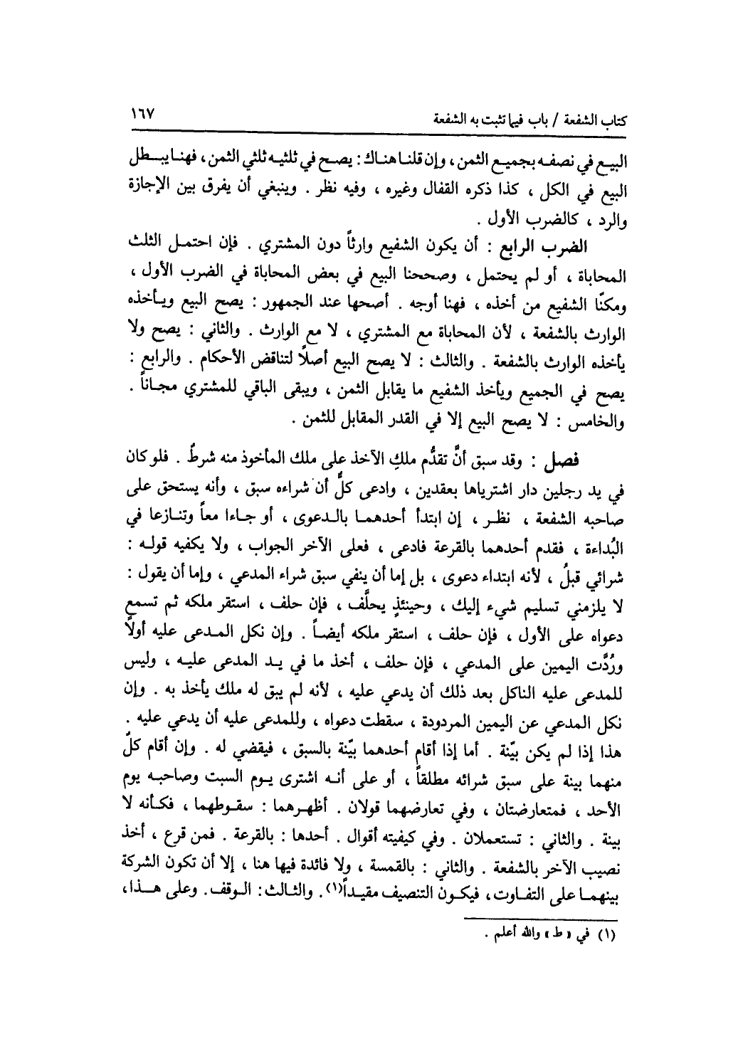 البيع في نصفه بجميع الثمن، وإن قلنا هناك: يصح في ثلثيه بثلثي الثمن، فهنا يبطل البيع في الكل، كذا ذكره القفال وغيره، وفيه نظر. وينبغي أن يفرق بين الاجازة والرد، كالضرب الاول. الضرب الرابع: أن يكون الشفيع وارثا دون المشتري. فان احتمل الثلث المحاباة، أو لم يحتمل، وصححنا البيع في بعض المحاباة في الضرب الاول، ومكنا الشفيع من أخذه، فهنا أوجه. أصحها عند الجمهور: يصح البيع ويأخذه الوارث بالشفعة، لان المحاباة مع المشتري، لا مع الوارث. والثاني: يصح ولا يأخذه الوارث بالشفعة. والثالث: لا يصح البيع أصلا لتناقض الاحكام. والرابع: يصح في الجميع ويأخذ الشفيع ما يقابل الثمن، ويبقى الباقي للمشتري مجانا. والخامس: لا يصح البيع إلا في القدر المقابل للثمن. فصل وقد سبق أن تقدم ملك الآخذ على ملك المأخوذ منه شرط. فلو كان في يد رجلين دار اشترياها بعقدين، وادعى كل أن شراءه سبق، وأنه يستحق على صاحبه الشفعة، نظر، إن ابتدأ أحدهما بالدعوى، أو جاءا معا وتنازعا في البداءة، فقدم أحدهما بالقرعة فادعى، فعلى الآخر الجواب، ولا يكفيه قوله: شرائي قبل، لانه ابتداء دعوى، بل إما أن يبقي سبق شراء المدعي، وإما أن يقول المدعي، وإما أن يقول: شرائي قبل، لانه ابتداء دعوى، بل إما أن ينفي سبق شراء المدعي، وإما أن يقول: لا يلزمني تسليم شئ إليك، وحينئذ يحلف، فان حلف، استقر ملكه ثم تسمع دعواه على الارل، فان حلف، استقر ملكه أيضا. وإن نكل المدعى عليه أولا وردت اليمين على المدعي، فإن حلف، أخذ ما يد المدعي عليه، وليس للمدعى عليه الناكل بعد ذلك أن يدعي عليه، لانه لم يبق له ملك يأخذ به. وإن نكل المدعي عن اليمين المردود، سقطت دعواه، وللمدعى عليه أن يدعي عليه. هذا إذا لم يكن بينة. أما إذا أقام أحدهما بينة بالسبق، فيقضى له. وإن أقام كل منهما بينة على سبق شرائه مطلقا، أو على أنه اشترى يوم السبت وصاحبه يوم الاحد، فمتعارضتان، وفي تعارضهما قولان. أظهرهما: سقوطهما، فكأنه لا بينة. والثاني: تستعملان. وفي كيفيته أقوال. أحدها: بالقرعة. فمن قرع، أخذ نصيب الآخر بالشفعة. والثاني: بالقسمة، ولا فائدة فيها هنا، إلا أن تكون الشركة بينهما على التفاوت، فيكون التصنيف مقيدا. والثالث الوقف. وعلى هذا،