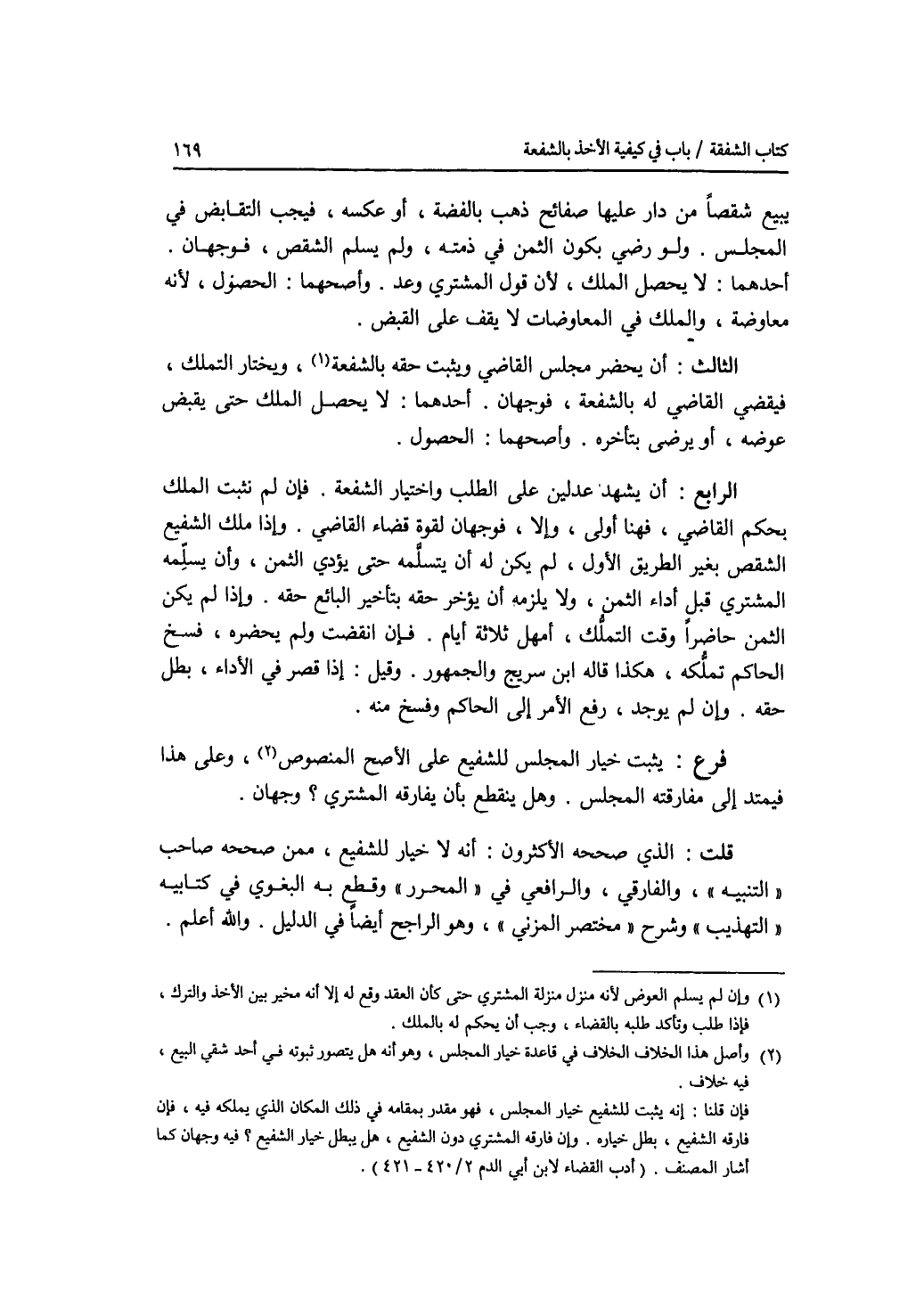 يبيع شقصا من دار عليها صفائح ذهب بالفضة، أو عكسه، فيجب التقابض في المجلس. ولو رضي بكون الثمن في ذمته، ولم يسلم الشقص، فوجهان. أحدهما: لا يحصل الملك، لان قول المشتري وعد. وأصحهما: الحصول، لانه معاوضة، والملك في المعاوضات لا يقف على القبض. الثالث: أن يحضر مجلس القاضي ويثبت حقه بالشفعة، ويختار التملك، فيقضي القاضي له بالشفعة، فوجهان. أحدهما: لا يحصل الملك حتى يقبض عوضه، أو يرضى بتأخره. وأصحهما: الحصول. الرابع: أن يشهد عدلين على الطلب واختيار الشفعة. فان لم نثبت الملك بحكم القاضي، فهنا أولى، وإلا، فوجهان لقوة قضاء القاضي. وإذا ملك الشفيع الشقص بغير الطريق الاول، لم يكن له أن يتسلمه حتى يؤدي الثمن، وأن يسلمه المشتري قبل أداء الثمن، ولا يلزمه أن يؤخر حقه بتأخير البائع حقه. وإذا لم يكن الثمن حاضرا وقت التملك، أمهل ثلاثة أيام، فان انقضت ولم يحضره، فسخ الحاكم تملكه، هكذا قاله ابن سريج والجمهور. وقيل: إذا قصر في الاداء، بطل حقه. وإن لم يوجد، رفع الامر إلى الحاكم وفسخ منه. فرع يثبت خيار المجلس للشفيع على الاصح المنصوص، وعلى هذا فيمتد إلى مفارقته المجلس. وهل ينقطع بأن يفارقه المشتري ؟ وجهان. قلت: الذي صححه الاكثرون: أنه لا خيار للشفيع، ممن صححه صاحب التنبيه، والفارقي، والرافعي في المحرر، وقطع به البغوي في كتابيه التهذيب وشرح مختصر المزني، وهو الراجح أيضا في الدليل. والله أعلم