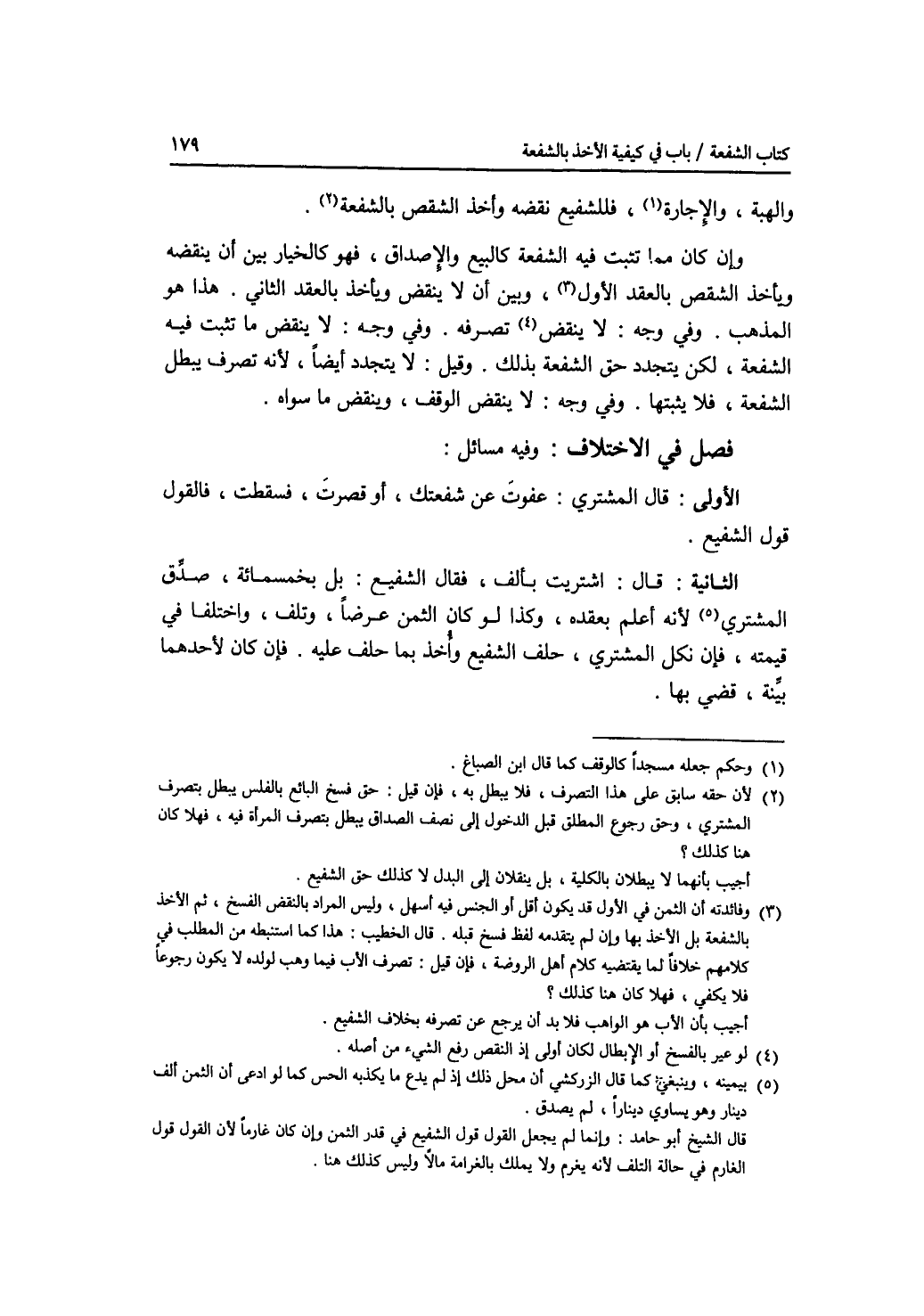 والهبة، والاجارة، فللشفيع نقضه وأخذ الشقص بالشفعة. وإن كان مما تثبت فيه الشفعة كالبيع والاصداق، فهو كالخيار بين أن ينقضه ويأخذ الشقص بالعقد الاول، وبين أن لا ينقض ويأخذ بالعقد الثاني. هذا هو المذهب. وفي وجه: لا ينقض تصرفه. وفي وجه: لا ينقض ما تثبت فيه الشفعة، لكن يتجدد حق الشفعة بذلك. وقيل: لا يتجدد أيضا، لانه تصرف يبطل الشفعة، فلا يثبتها. وفي وجه: لا ينقض الوقف، وينقض ما سواه. فصل في الاختلاف وفيه مسائل. الاولى: قال المشتري: عفوت عن شفعتك، أو قصرت، فسقطت، فالقول قول الشفيع. الثانية: قال: اشتريت بألف، فقال الشفيع: بل بخمسمائة، صدق المشتري، لانه أعلم بعقده. وكذا لو كان الثمن عرضا، وتلف، واختلفا في قيمته، فإن نكل المشتري، حلف الشفيع وأخذ بما حلف عليه. فإن كان لاحدهما بينة، قضي بها.