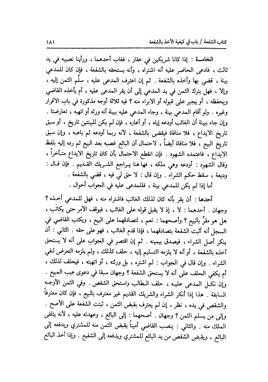 الخامسة: إذا كانا شريكين في عقار، فغاب أحدهما، ورأينا نصيبه في يد ثالث، فادعى الحاضر عليه أنه اشتراه، وأنه يستحقه بالشفعة، فإن كان للمدعي بينة، قضي بها وأخذه بالشفعة. ثم إن اعترف المدعى عليه، سلم الثمن إليه، وإلا، فهل يترك الثمن في يد المدعى إلى أن يقر المدعى عليه، أم يأخذه القاضي وحفظه، أم يجبر على قبوله أو الابراء منه ؟ فيه ثلاثة أوجه مذكورة في باب الاقرار وغيره. ولو أقام المدعي بينة، وجاء المدعى عليه ببينة أنه ورثه أو اتهبه، تعارضتا. وإن جاء ببينة أن الغائب أودعه إياه، أو أعاره، فإن لم يكن للبينتين تاريخ، أو سبق تاريخ الايداع، فلا منافاة فيقضى بالشفعة، لانه ربما أودعه ثم باعه، وإن سبق تاريخ البيع، فلا منافاة أيضا، لاحتمال أن البائع غصبه بعد البيع ثم رده إليه بلفظ الايداع، فاعتمده الشهود. فإن انقطع الاحتمال بأن كان تاريخ الايداع متأخرا، وقال الشهود: أودعه وهي ملكه، فهاهنا يراجع الشريك القديم. فإن قال: وديعة، سقط حكم الشراء. وإن قال: لا حق لي فيه، قضي بالشفعة. أما إذا لم يكن للمدعي بينة، فللمدعى عليه في الجواب أحوال. أحدها: أن يقر بأنه كان لذلك الغائب فاشتراه منه، فهل للمدعي أخذه ؟ وجهان. أحدهما: لا، إذ لا يقبل قوله على الغائب، فيوقف الامر حتى يكاتب، هل هو مقر بالبيع ؟ وأصحهما: نعم، لتصادقهما على البيع، ويكتب القاضي في السجل أنه أثبت الشفعة بتصادقهما، فإذا قدم الغائب، فهو على حقه. الثاني: أن ينكر أصل الشراء، فيصدق بيمينه. ثم إن اقتصر في الجواب إنه لا يستحق اخذه بالشفعة أو أنه لا يلزمه التسلم إليه حلف ذلك ولم يلزمه التعرض لنفي الشراء. وإن قال في الجواب: لم اشتره، بل ورثته، أو اتهبته، فيحلف لذلك، أم يكفي الحلف على أنه لا يستحق الشفعة ؟ وجهان سبقا في دعوى عيب المبيع. وإن نكل المدعى عليل، حلف الطالب واستحق الشقص. وفي الثمن الاوجه السابقة. هذا إذا أنكر الشراء والشريك القديم غير معترف بالبيع، فإن كان معترفا والشقص في يده، نظر، إن لم يعترف بقبض الثمن، ثبتت الشفعة على الاصح. وإلى من يسلم الثمن ؟ وجهان. أصحهما: إلى البائع، وعهدته عليه، لانه يتلقى الملك منه. والثاني: ينصب القاضي أمينا يقبض الثمن منه للمشتري ويدفعه إلى البائع، ويقبض الشقص من يد البائع للمشتري ويدفعه إلى الشفيع. وإذا أخذ البائع