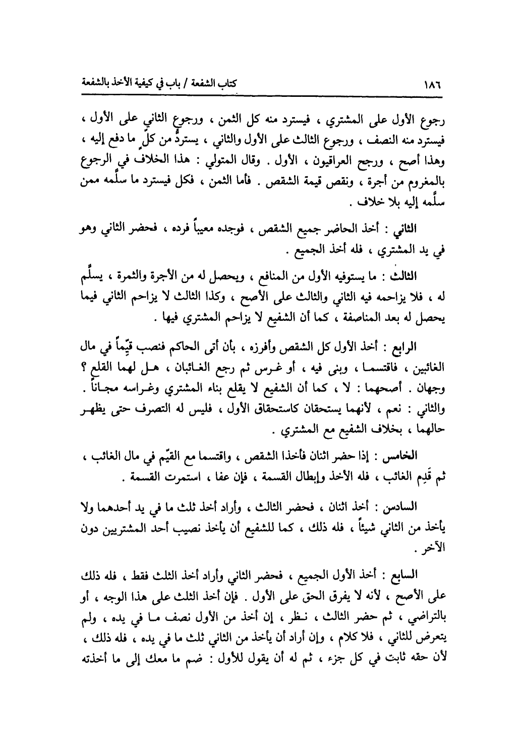 رجوع الاول على المشتري، فيسترد منه كل الثمن، ورجوع الثاني على الاول، فيسترد منه النصف، ورجوع الثالث على الاول والثاني، يسترد من كل ما دفع إليه، وهذا أصح، ورجح العراقيون، الاول. وقال المتولي: هذا الخلاف في الرجوع بالمغروم من أجرة، ونقص قيمة الشقص. فأما الثمن، فكل فيسترد ما سلمه ممن سلمه إليه بلا خلاف. الثاني: أخذ الحاضر جميع الشقص، فوجده معيبا فرده، فحضر الثاني وهو في يد المشتري، فله أخذ الجميع. الثالث: ما يستوفيه الاول من المنافع، ويحصل له من الاجرة والثمرة، يسلم له، فلا يزا حمه فيه الثاني والثالث على الاصح، وكذا الثالث لا يزاحم الثاني فيما يحصل له بعد المناصفة، كما أن الشفيع لا يزاحم المشتري فيها. الرابع: أخذ الاول كل الشقص وأفرزه، بأن أتى الحاكم فنصب قيما في مال الغائبين، فاقتسما، وبنى فيه، أو غرس ثم رجع الغائبان، هل لهما القلع ؟ وجهان. أصحهما: لا، كما أن الشفيع لا يقلع بناء المشتري وغراسه مجانا. والثاني: نعم، لانهما يستحقان كاستحقاق الاول، فليس له التصرف حتى يظهر حالهما، بخلاف الشفيع مع المشتري. الخامس: إذا حضر اثنان فأخذا الشقص، واقتسما مع القيم في مال الغائب، ثم قدم (الغائب)، فله الاخذ وإبطال القسمة، فان عفا، استمرت القسمة. السادس: أخذ اثنان، فحضر الثالث، وأراد أخذ ثلث ما في يد أحدهما ولا يأخذ من الثاني شيئا، فله ذلك، كما للشفيع أن يأخذ نصيب أحد المشتريين دون الآخر. السابع: أخذ الاول الجميع، فحضر الثاني وأراد أخذ الثلث فقط، فله ذلك على الاصح، لانه لا يفرق الحق على الاول. فان أخذ الثلث على هذا الوجه، أو بالتراضي، ثم حضر الثالث، نظر، إن أخذ من الاول نصف ما في يده، ولم يتعرض للثاني، فلا كلام، وإن أراد أن يأخذ من الثاني ثلث ما في يده، فله ذلك، لان حقه ثابت في كل جزء، ثم له أن يقول للاول: ضم ما معك إلى ما أخذته