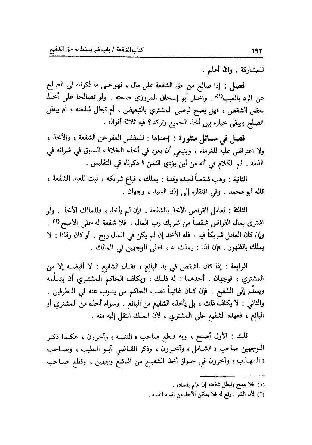 فصل في مسائل منثورة إحداها : للمفلس العفو عن الشفعة، والاخذ، ولا اعتراض عليه للغرماء، وينبغي أن يعود في أخذه الخلاف السابق في شرائه في الذمة. ثم الكلام في أنه من أين يؤدي الثمن ؟ ذكرناه في التفليس. الثانية: وهب شقصا لعبده وقلنا: يملك، فباع شريكه، ثبت للعبد الشفعة، قاله أبو محمد. وفي افتقاره إلى إذن السيد، وجهان. الثالثة: لعامل القراض الاخذ بالشفعة فإن لم يأخذ فللمالك الاخذ ولو اشترى مال القاضي شقصا من شريك رب المال، فلا شفعة له على الاصح. وإن كان العامل شريكا فيه، فله الاخذ إن لم يكن في المال ربح، أو كان وقلنا: لا يملك بالظهور. فإن قلنا: يملك به، فعلى الوجهين في المالك. الرابعة: إذا كان الشقص في يد البائع، فقال الشفيع: لا أقبضه إلا من المشتري، فوجهان. أحدهما: له ذلك، ويكلف الحاكم المشتري أن يتسلمه ويسلم إلى الشفيع. فإن كان غائبا نصب الحاكم من ينوب عنه في الطرفين. والثاني: لا يكلف ذلك، بل يأخذه الشفيع من البائع. وسواء أخذه من المشتري أو البائع، فعهدة الشفيع على المشتري، لان الملك انتقل إليه منه. قلت: الاول أصح، وبه قطع صاحب التنبيه وآخرون، هكذا ذكر الوجهين صاحب الشامل وآخرون، وذكر القاضي أبو الطيب، وصاحب المهذب وآخرون في جواز أخذ الشفيع من البائع وجهين، وقطع صاحب
