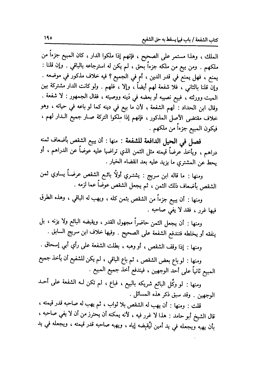 فصل في الحيل الدافعة للشفعة منها : أن يبيع الشقص بأضعاف ثمنه دراهم، ويأخذ عرضا قيمتمثل الثمن الذي تراضيا عليه عوضا عن الدراهم، أو يحط عن المشتري ما يزيد عليبعد انقضاء الخيار. ومنها: ما قاله ابن سريج: يشتري أولا بائع الشقص عرضا يساوي ثمن الشقص بأضعاف ذلك الثمن، ثم يجعل الشقص عوضا عما لزمه. ومنها أن يبيع جزءا من الشقص بثمن كله، ويهب له الباقي، وهذه الطرق فيها غرر، فقد لا يفي صاحبه. ومنها: أن يجعل الثمن حاضرا مجهول القدر، ويقبضه البائع ولا يزنه، بل ينفقه أو يخلطه فتندفع الشفعة على الصحيح. وفيها خلاف ابن سريج السابق. ومنها: إذا وقف الشقص، أو وهبه، بطلت الشفعة على رأي أبي إسحاق. ومنها: لو باع بعض الشقص، ثم باع الباقي، لم يكن للشفيع أن يأخذ جميع المبيع ثانيا على أحد الوجهين، فيندفع أخذ جميع المبيع. ومنها: لو وكل البائع شريكه بالبيع، فباع، لم تكن له الشفعة على أحد الوجهين. وقد سبق ذكر هذه المسائل. قلت: ومنها: أن يهب له الشقص بلا ثواب، ثم يهب له صاحبة قدر قيمته، قال الشيخ أبو حامد: هذا لا غرر فيه، لانه يمكنه أن يحترز من أن لا يفي صاحبه، بأن يهبه ويجعله في يد أمين ليقبضه إياه، ويهبه صاحبه قدر قيمته، ويجعله في يد