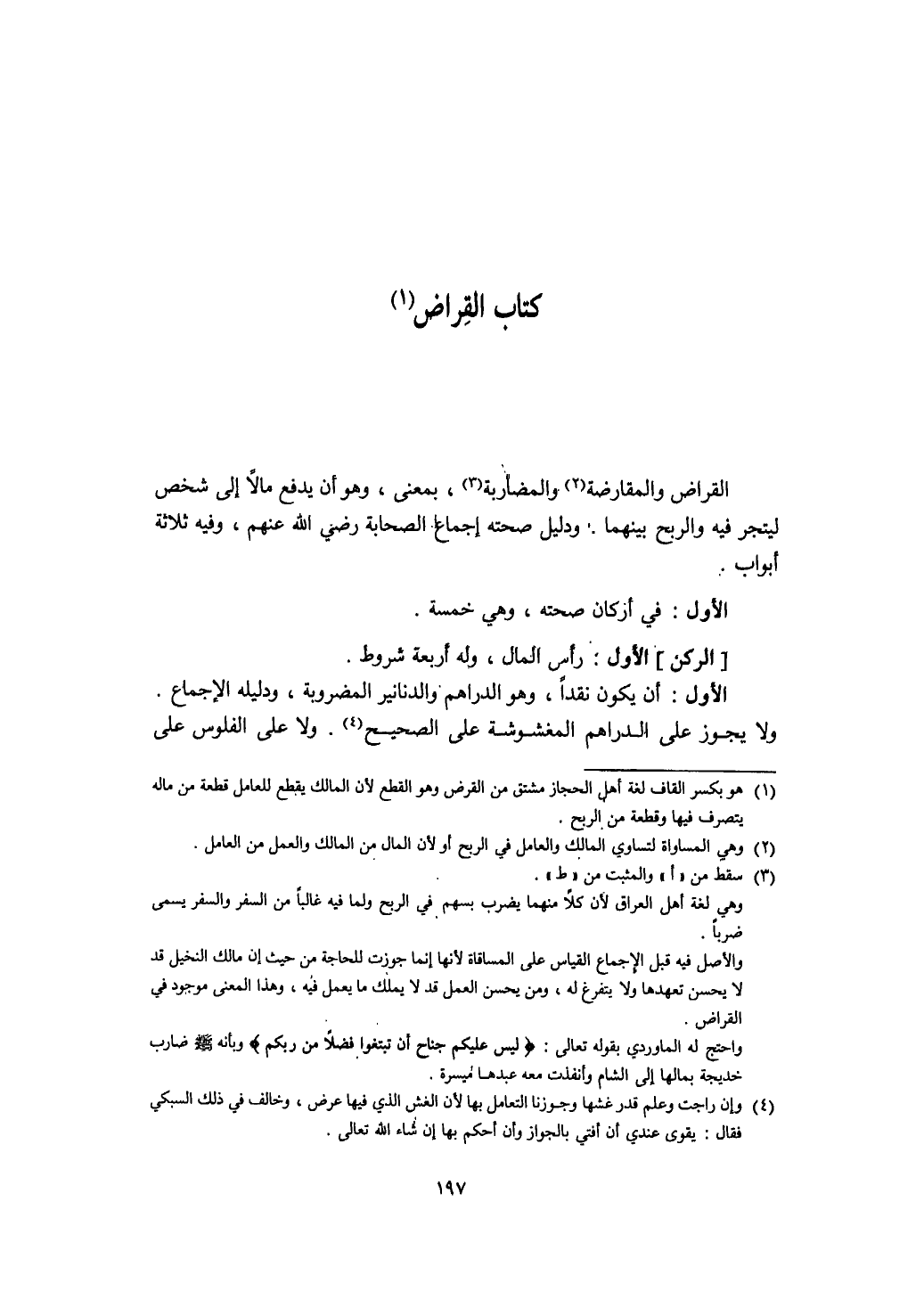القراض والمقارضة والمضاربة، بمعنى، وهو أن يدفع مالا إلى شخص ليتجر فيه والربح بينهما. ودليل صحته إجماع الصحابة رضي الله عنهم، وفيه ثلاثة أبواب.