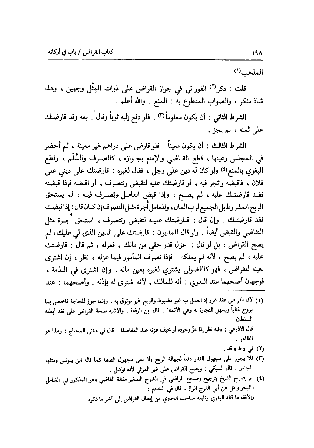 المذهب. قلت: قد ذكر الفوراني في جواز، القراض على ذوات المثل وجهين، وهذا شاذ منكر، والصواب المقطوع به: المنع. والله أعلم الشرط الثاني: أن يكون معلوما. فلو دفع إليه ثوبا وقال: بعه وقد قارضتك على ثمنه، لم يجز. الشرط الثالث: أن يكون معينا. فلو قارض على دراهم غير معينة، ثم أحضر في المجلس وعينها، قطع القاضي والامام بجوازه، كالصرف والسلم، وقطع البغوي بالمنع. ولو كان له دين على رجل، فقال لغيره: قارضتك على ديني على فلان، فاقبضه واتجر فيه، أو قارضتك عليه لتقبض وتتصرف، أو أقبضه فإذا قبضته فقد قارضتك عليه، لم يصح، وإذا قبض العامل وتصرف فيه، لم يستحق الربح المشروط، بل الجميع لر ب المال، وللعامل أجرة مثل التصرف إن كان قال: إذا قبضت فقد قارضتك. وإن قال: قارضتك عليه لتقبض وتتصرف، استحق أجرة مثل التقاضي والقبض أيضا. ولو قال للمديون: قارضتك على الدين الذي لي عليك، لم يصح القراض، بل لو قال: اعزل قدر حقي من مالك، فعزله، ثم قال: قارضتك عليه، لم يصح، لانه لم يملكه. فإذا تصرف المأمور فيما عزله، نظر، إن اشترى بعينه للقراض، فهو كالفضولي يشتري لغيره بعين ماله. وإن اشترى في الذمة، فوجهان. أصحهما عند البغوي: أنه للمالك، لانه اشترى له باذنه. وأصحهما: عند