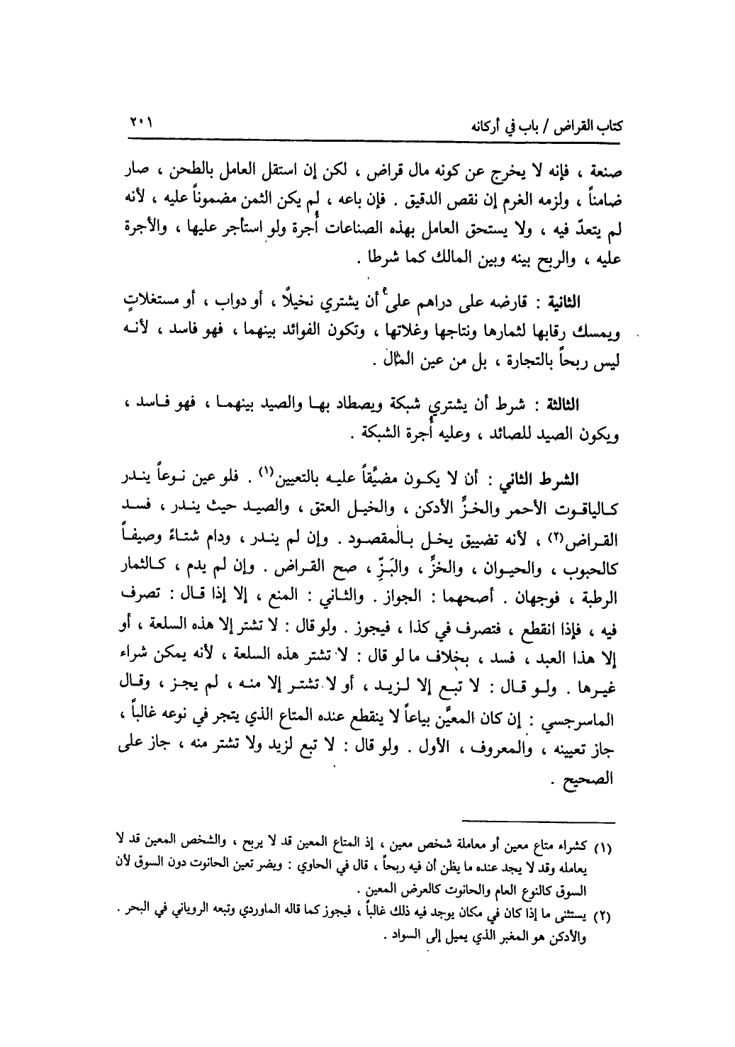 صنعة، فإنه لا يخرج عن كونه مال قراض، لكن إن استقل االعامل بالطحن، صار ضامنا، ولزمه الغرم إن نقض الدقيق. فإن باعه، لم يكن الثمن مضمونا عليه، لانه لم يتعد فيه، ولا يستحق العامل بهذه الصناعات أجرة ولو استأجر عليها، والاجرة عليه، والربح بينه وبين المالك كما شرطا. الثانية: قارضه على دراهم على أن يشتري نخيلا، أو دواب، أو مستغلات ويمسك رقابها لثمارها ونتاجها وغلاتها، وتكون الفوائد بينهما، فهو فاسد، لانه ليس ربحا بالتجارة، بل من عين المال. الثالثة: شرط أن يشتري شبكة ويصطاد بها والصيد بينهما، فهو فاسد، ويكون الصيد للصائد، وعليه أجرة الشبكة. الشرط الثاني: أن لا يكون مضيقا عليه بالتعيين. فلو عين نوعا يندر كالياقوت الاحمر والخز الادكن، والخيل العتق، والصيد حيث يندر، فسد القراض، لانه تضييق يخل بالمقصود. وإن لم يندر، ودام شتاء وصيفا كالحبوب، والحيوان، والخز، والبز، صح القراض. وإن لم يدم، كالثمار الرطبة، فوجهان. أصحهما: الجواز، والثاني: المنع، إلا إذا قال: تصرف فيه، فإذا انقطع، فتصرف في كذا، فيجوز. ولو قال: لا تشتر إلا هذه السلعة، أو إلا هذا العبد، فسد، بخلاف ما لو قال: لا تشتر هذه السلعة، لانه يمكن شراء غيرها. ولو قال: لاتبع إلا لزيد، أو لا تشتر إلا منه، لم يجز، وقال الماسرجسي: إن كان المعين بياعا لا ينقطع عنده المتاع الذي يتجر في نوعه غالبا، جاز تعيينه، والمعروف، الاول. ولو قال: لا تبع لزيد ولا تشتر منه، جاز على الصحيح.