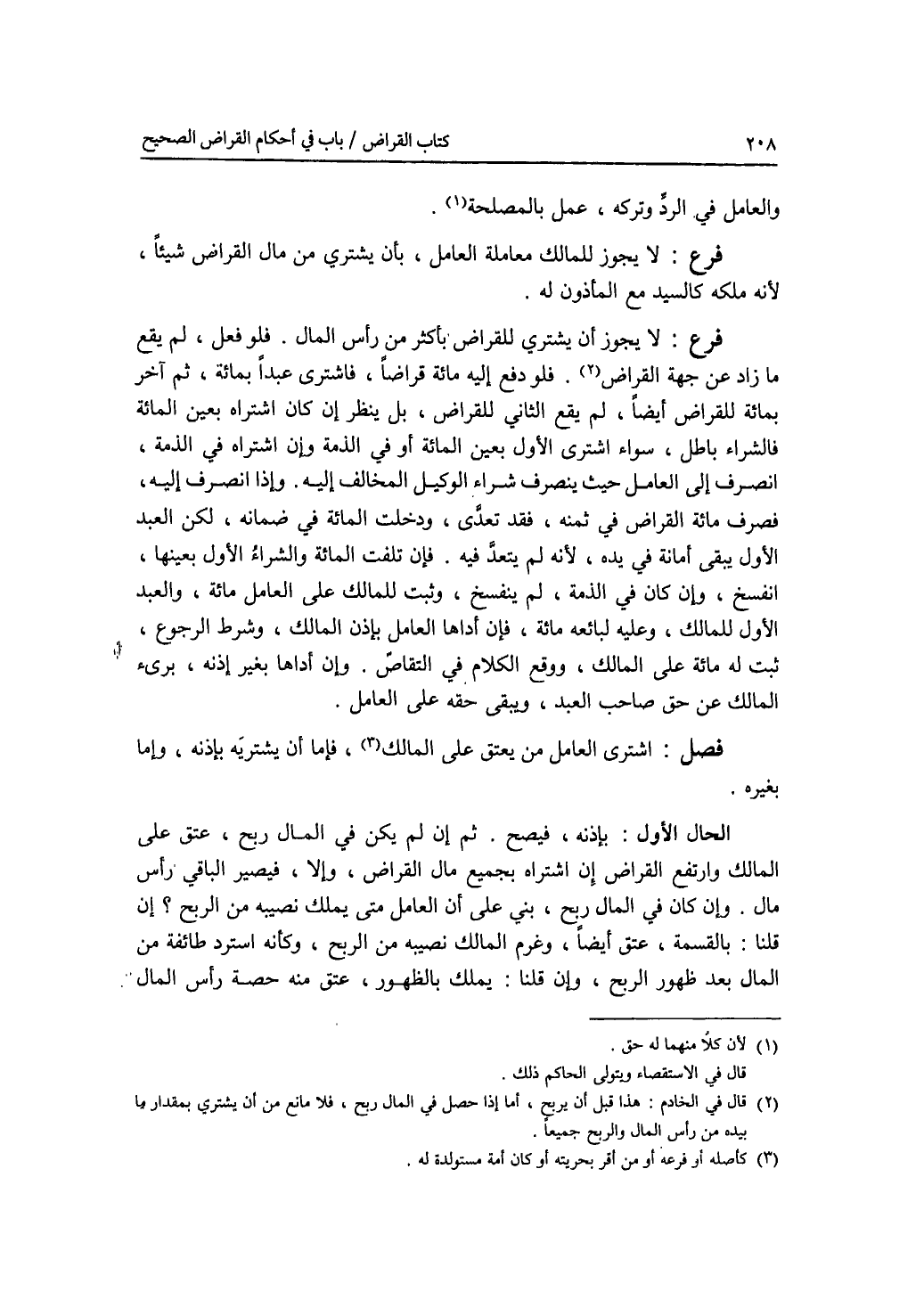 والعامل في الرد وتركه، عمل بالمصلحة. فرع لا يجوز للمالك معاملة العامل، بأن يشتري من مال القراض شيئا، لانه ملكه كالسيد مع المأذون له. فرع لا يجوز أن يشتري للقراض بأكثر من رأس المال. فلو فعل، لم يقع ما زاد عن جهة القراض. فلو دفع إليه مائة قراضا، فاشترى عبدا بمائة، ثم آخر بمائة للقراض أيضا، لم يقع الثاني للقراض، بل ينظر إن كان اشتراه بعين المائة فالشراء باطل، سواء اشترى الاول بعين المائة أو في الذمة. وإن اشتراه في الذمة، انصرف إلى العامل حيث ينصرف شراء الوكيل المخالف إليه. وإذا انصرف إليه، فصرف مائة القراض في ثمنه، فقد تعدى، ودخلت المائة في ضمانه، لكن العبد الاول يبقى أمانة في يده لانه لم يتعد فيه. فإن تلفت المائة والشراء الاول بعينها، انفسخ، وإن كان في الذمة، لم ينفسخ، وثبت للمالك على العامل مائة، والعبد الاول للمالك، وعليه لبائعه مائة، فإن أداها العامل باذن المالك، وشرط الرجوع، ثبت له مائة على المالك، ووقع الكلام في التقاص. وإن أداها بغير إذنه، برئ المالك عن حق صاحب العبد، ويبقى حقه على العامل.