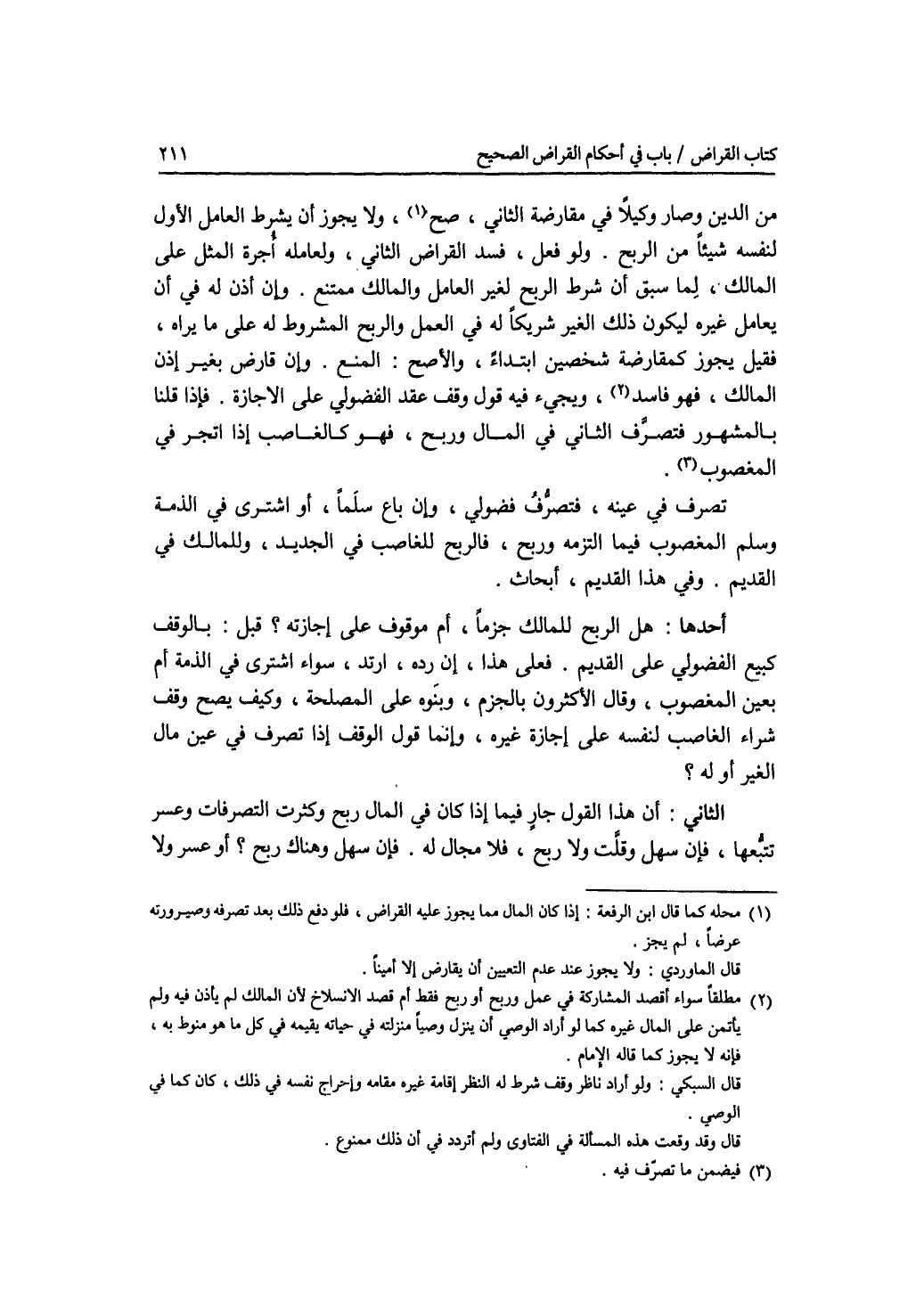 من الدين وصار وكيلا في مقارضة الثاني، صح، ولا يجوز أن يشرط العامل الاول لنفسه شيئا من الربح. ولو فعل، فسد القراض الثاني، ولعامله أجرة المثل على المالك، لما سبق أن شرط الربح لغير العامل والمالك ممتنع. وإن أذن (له) في أن يعامل غيره ليكون ذلك الغير شريكا له في العمل والربح المشروط له على ما يراه، فقيل: يجوز كمقارضة شخصين ابتداء، والاصح: المنع. وإن قارض بغير إذن المالك، فهو فاسد، ويجئ فيه قول وقف عقد الفضولي على الاجازة. فإذا قلنا بالمشهور، فتصرف الثاني في المال وربح، فهو كالغاصب إذا اتجر في المغصوب. تصرف في عينه، فتصرف فضولي، وإن باع سلما، أو اشترى في الذمة وسلم المغصوب فيما التزمه وربح، فالربح للغاصب في الجديد، وللمالك في القديم. وفي هذا القديم، أبحاث. أحدها: هل الربح للمالك جزما، أم موقوف على إجازته ؟ قيل: بالوقف كبيع الفضولي على القديم. فعلى هذا، إن رده، ارتد، سواء اشترى في الذمة أم بعين المغصوب، وقال الاكثرون بالجزم، وبنوه على المصلحة، وكيف يصح وقف شراء الغاصب لنفسه على إجازة غيره، وإنما قول الوقف إذا تصرف في عين مال الغير أو له ؟ الثاني: أن هذا القول جار فيما إذا كان في المال ربح وكثرت التصرفات وعسر تتبعها، فإن سهل وقلت ولا ربح، فلا مجال له. فإن سهل وهناك ربح، أو عسر ولا