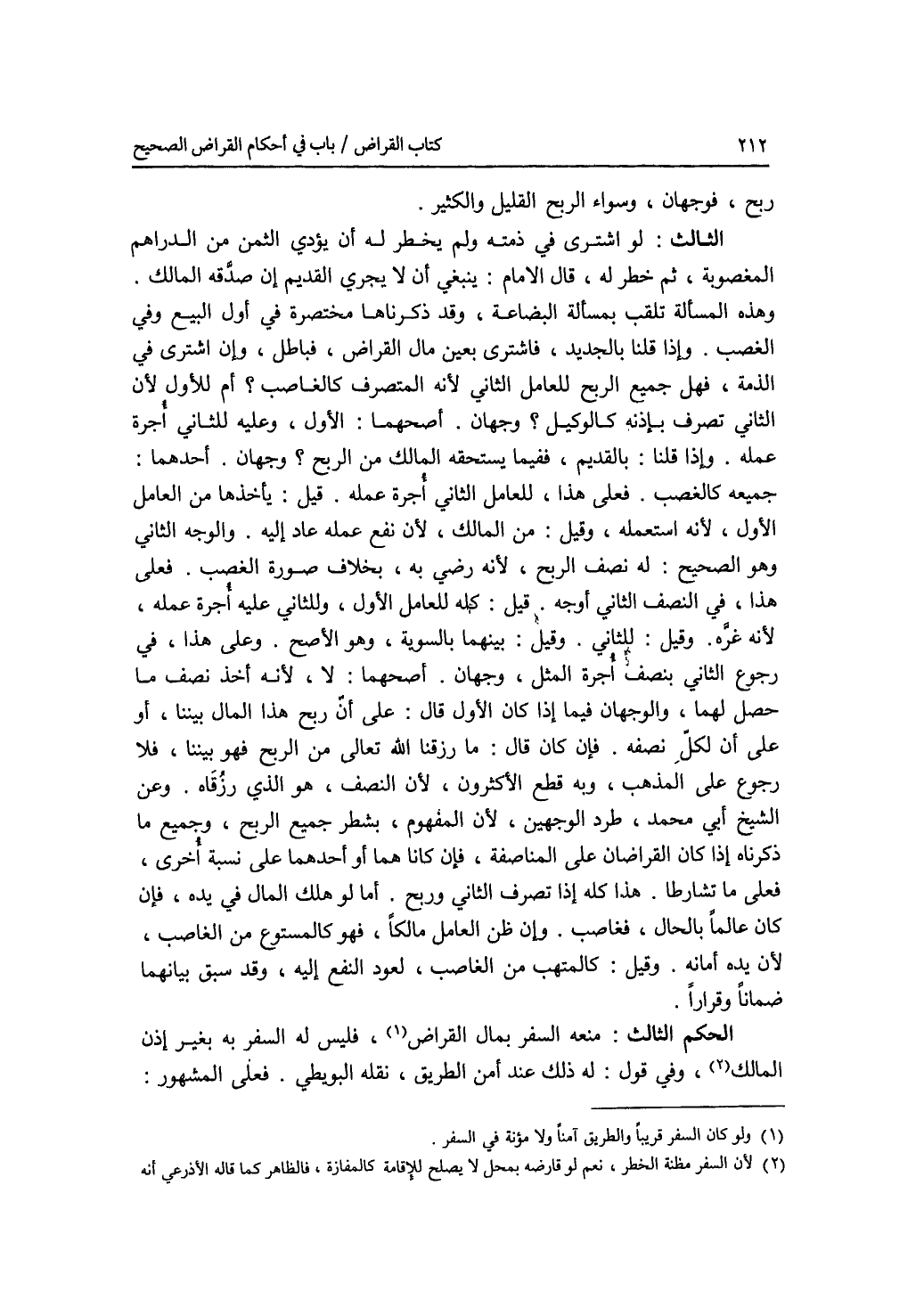 ربح، فوجهان، وسواء في الربح القليل والكثير. الثالث: لو اشترى في ذمته ولم يخطر له أن يؤدي الثمن من الدراهم المغصوبة، ثم خطر له، قال الامام: ينبغي أن لا يجري القديم إن صدقه المالك. وهذه المسألة تلقب بمسألة البضاعة، وقذكرناها مختصرة في أول البيع وفي الغصب. وإذا قلنا بالجديد، فاشترى بعين مال القراض، فباطل، وإن اشترى في الذمة، فهل جميع الربح للعامل الثاني لانه المتصرف كالغاصب ؟ أم للاول لان الثاني تصرف باذنه كالوكيل ؟ وجهان. أصحهما: الاول، وعليه للثاني أجرة عمله. وإذا قلنا: بالقديم، ففيما يستحقه المالك من الربح ؟ وجهان. أحدهما: جمعيه كالغصب. فعلى هذا، للعامل الثاني أجرة عمله قيل: يأخذها من العامل الاول، لانه استعمله، وقيل: من المالك، لان نفع عمله عاد إليه. و (الوجه) الثاني وهو الصحيح: له نصف الربح، لانه رضي بخلاف به، بخلاف صورة الغصب. فعلى هذا، في النصف الثاني أوجه. قيل: كله للعامل الاول، وللثاني عليه أجرة عمله، لانه غرة، وقيل: للثاني. وقيل: كله للعامل الاول، وللثاني عليه أجرة عمله، لانه غرة. وقيل: للثاني. وقيل: بينهما بالسوية، وهو الاصح. وعلى هذا، في رجوع الثاني بنصف أجرة المثل، وجهان. أصحهما: لا، لانه أخذ نصف ما حصل لهما، والوجهان فيما إذا كان الاول قال: على أن ربح هذا المال بيننا، أو على أن لكل نصفه. فإن كان قال: ما رزقنا الله تعالى من الربح فهو بيننا، فلا رجوع على المذهب، وبه قطع الاكثرون، لان النصف، هو الذي رزفاه. وعن الشيخ أبي محمد، طرد الوجهين، لان المفهوم، بشطر جميع الربح. وجميع ما ذكرناه إذا كان القراضان على المناصفة، فإن كانا هما أو أحدهما على نسبة أخرى، فعلى ما تشارطا. هذا كله إذا تصرف الثاني وربح. أما لو هلك المال في يده، فإن كان عالما بالحال، فغاصب. وإن ظن العامل مالكا، فهو كالمستودع من الغاصب، لان يده أمانة. وقيل: كالمتهب من الغاصب، لعود النفع إليه، وقد سبق بيانهما ضمانا وقرارا. الحكم الثالث: منعه السفر بمال القراض، فليس له السفر به بغير إذن المالك، وفي قول: له ذلك عند أمن الطريق، نقله البويطي. فعلى المشهور: