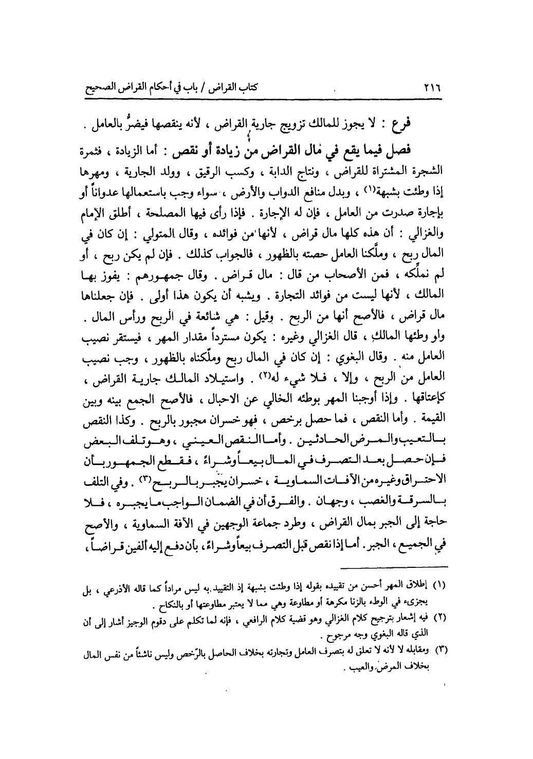 فصل فيما يقع في مال القراض من زيادة أو نقص أما الزيادة، فثمرة الشجرة المشتراة للقراض، ونتاج الدابة، وكسب الرقيق، وولد الجارية، ومهرها إذا وطئت بشبهة، وبدل منافع الدواب والارض، وسواء وجب باستعمالها عدوانا أو باجارة صدرت من العامل، فإن له الاجارة. فإذا رأى فيها المصلحة، أطلق الامام والغزالي: أن هذه كلها مال قراض، لانها من فوائده، وقال المتولي: إن كان في المال ربح، وملكنا العامل حصته بالظهور، فالجواب كذلك. فإن لم يكن ربح، أو لم نملكه، فمن الاصحاب من قال: مال قراض. وقال جمهورهم: يفوز بها المالك، لانها ليست من فوائد التجارة. ويشبه أن يكون هذا أولى. فإن جعلناها مال قراض، فالاصح أنها من الربح. وقيل: هي شائبة في الربح ورأس المال. ولو وطئها المالك، قال الغزالي وغيره: يكون مستردا مقدار المهر، فيستقر نصيب العامل منه. وقال البغوي: إن كان في المال ربح وملكناه بالظهور، وجب نصيب العامل من الربح، وإلا، فلا شئ له. واستيلاد المالك جارية القراض، كاعتاقها. وإذا أوجبنا المهر بوطئه الخالي عن الاحبال، فالاصح الجمع بينه وبين القيمة. وأما النقص، فما حصل برخص، فهو خسران مجبور بالربح. وكذا النقص بالتعيب والمرض الحادثين. وأما النقص العيني، وهو تلف البعض، فإن حصل بعد التصرف في المال بيعا وشراء، فقطع الجمهور بأن الاحتراق وغيره من الآفات السماوية، خسران يجبر بالربح. وفي التلف بالسرقة والغصب، وجهان. والفرق أن في الضمان الواجب ما يجبره، فلا حاجة إلى الجبر بمال القراض، وطرد جماعة الوجهين في الآفة السماوية، والاصح في الجميع، الجبر. أما إذا نقص قبل التصر ف بيعا وشراء، بأن دفع إليه ألفين قراضا،