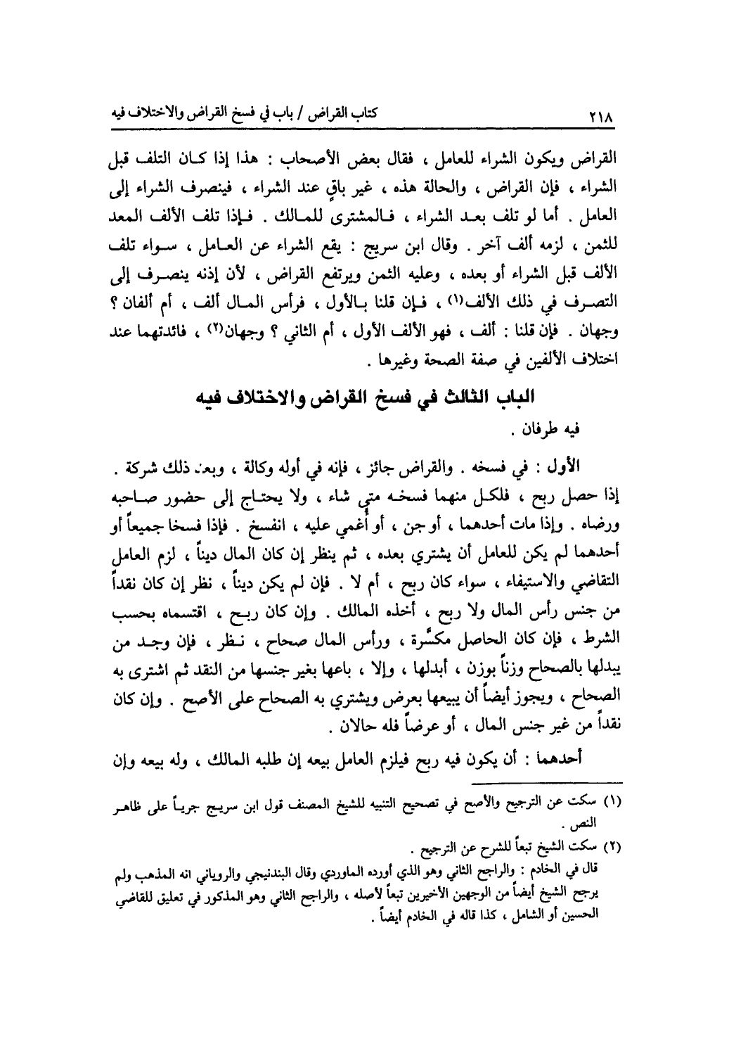 الباب الثالث : في فسخ القراض والاختلاف فيه