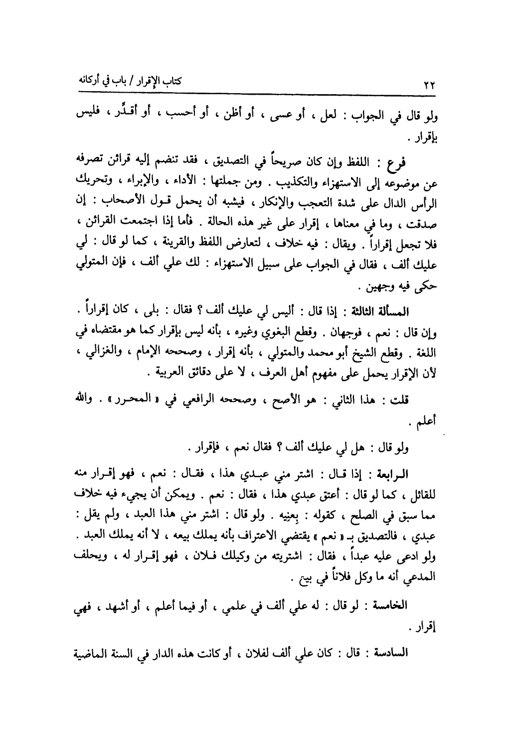 ولو قال في الجواب: لعل، أو عسى، أو أظن، أو أحسب، أو أقدر، فليس بإقرار. فرع اللفظ وإن كان صريحا في التصديق، فقد تنضم إليه قرائن تصرفه عن موضوعه إلى الاستهزاء والتكذيب. ومن جملتها: الاداء، والابراء، وتحريك الرأس الدال علشدة التعجب والانكار، فيشبه أن يحمل قول الاصحاب: إن صدقت، وما في معناها، إقرار على غير هذه الحالة. فأما إذا اجتمعت القرائن، فلا تجعل إقرارا. ويقال: فيه خلاف، لتعارض اللفظ والقرينة، كما لو قال: لي عليك ألف، فقال فالجواب على سبيل الاستهزاء: لك علي ألف، فإن المتولي حكى فيه وجهين. المسألة الثالثة: إذا قال: أليس لي عليك ألف ؟ فقال: بلى، كان إقرارا. وإن قال: نعم، فوجهان. وقطع البغوي وغيره، بأنه ليس بإقرار كما هو مقتضاه في اللغة. وقطع الشيخ أبو محمد والمتولي، بأنه إقرار، وصححه الامام، والغزالي، لان الاقرار يحمل على مفهوم أهل العرف، لا على دقائق العربية. قلت: هذا الثاني: هو الاصح، وصححه الرافعي في المحرر. والله أعلم. ولو قال: هل لي عليك ألف ؟ فقال: نعم، فاقرار. الرابعة: إذا قال: اشتر مني عبدي هذا، فقال: نعم، فهو إقرار منه للقائل، كما لو قال: أعتق عبدي هذا، فقال: نعم. ويمكن أن يجئ فيه خلاف مما سبق في الصلح، كقوله: بعنيه. ولو قال: اشتر مني هذا العبد، ولم يقل: عبدي، فالتصديق بنعم يقتضي الاعتراف بأنه يملك بيعه، لاأنه يملك العبد. ولو ادعى عليه عبدا، فقال: اشتريته من وكيلك فلان، فهو إقرار له، ويحلف المدعي أنه ما وكل فلانا في بيع. الخامسة: لو قال: له علي ألف في علمي، أو فيما أعلم، أو أشهد، فهي إقرار. السادسة: قال: كان علي ألف، أو كانت هذه الدار في السنة الماضية