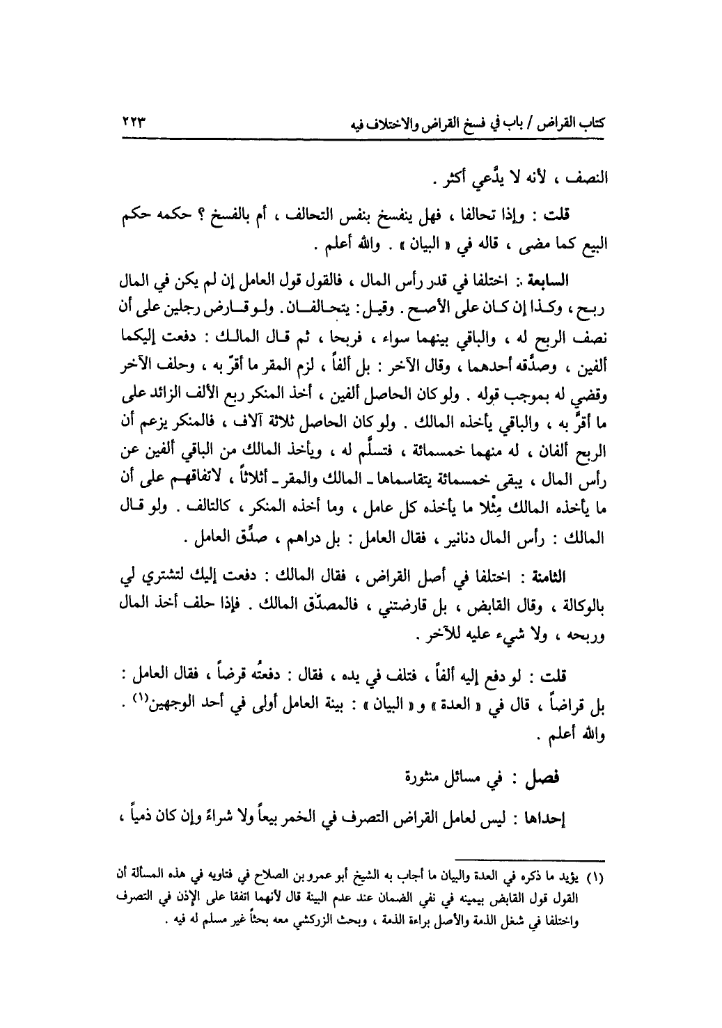 فصل في مسائل منثورة إحداها: ليس لعامل القراض التصرف في الخمر بيعا ولا شراء وإن كان ذميا،