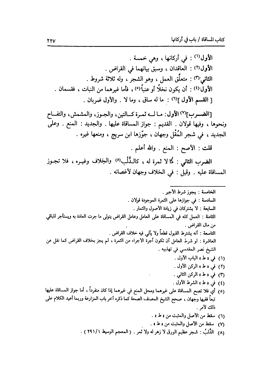 الركن الثاني : متعلق العمل، وهو الشجر، وله ثلاثة شروط. (الشرط) الاول: أن يكون نخلا أو عنبا، فأما غيرهما من النبات، فقسمان. (القسم الاول): ماله ساق، ومالا. والاول ضربان. (الضرب) الاول: ماله ثمرة كالتين، والجوز، والمشمش، والتفاح ونحوها، وفيها قولان. القديم: جواز المساقاة عليها. والجديد: المنع. وعلى الجديد، في شجر المقل وجهان، جوزها ابن سريج، ومنها غيره. قلت: الاصح: المنع. والله أعلم الضرب الثاني: ما لا ثمرة له، كالدلب والخلاف ويره، فلا تجوز المساقاة عليه. وقيل: في الخلاف وجهان لاغصانه.