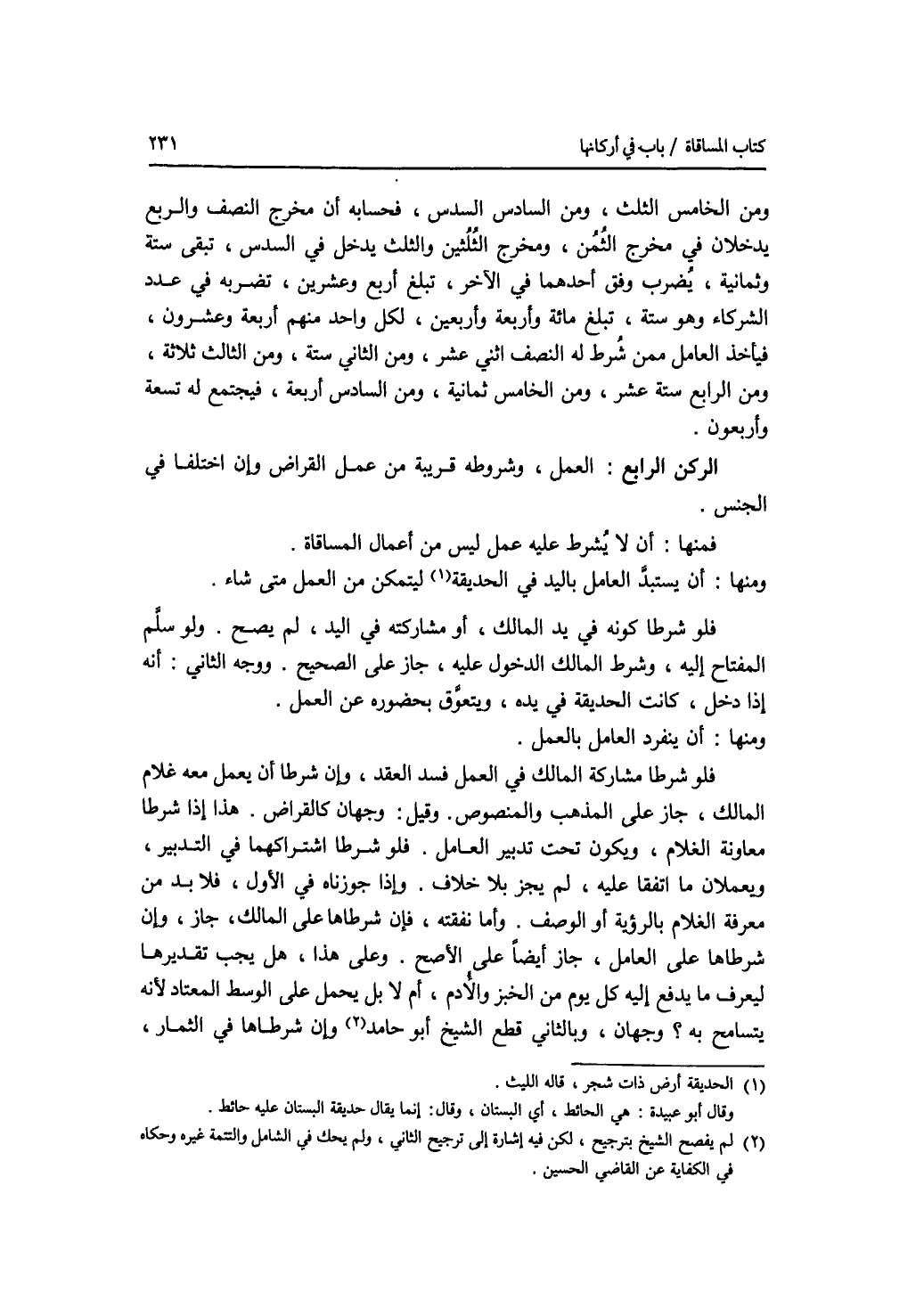 الركن الرابع : العمل، (وشروطه) قريبة من عمل القراض وإن اختلفا في الجنس. فمنها: أن لا يشرط عليه عمل ليس من أعمال المساقاة. ومنها: أن يستبد العامل باليد في الحديقة ليتمكن من العمل متى شاء. فلو شرطا كونه في يد المالك، أو مشاركته في اليد، لم يصح. ولو سلم المفتاح إليه، وشرط المالك الدخول عليه، جاز على الصحيح. ووجه الثاني: أنه إذا دخل، كانت الحديقة في يده، ويتعوق بحضوره العمل. ومنها: أن ينفرد العامل بالعمل. فلو شرطا مشاركة المالك في العمل فسد العقد، وإن شرطا أن يعمل معه غلام المالك، جاز على المذهب والمنصوص. وقيل: وجهان كالقراض. هذا إذا شرطا معاونة الغلام، ويكون تحت تدبير العامل. فلو شرطا اشتراكهما في التدبير، ويعملان ما اتفقا عليه، لم يجز بلا خلاف. وإذا جوزناه في الاول، فلا بد من معرفة الغلام بالرؤية أو الوصف. وأما نفقته، فإن شرطاها على المالك، جاز، وإن شرطاها على العامل، جاز أيضا على الاصح. وعلى هذا، هل يجب تقديرها ليعرف ما يدفع إليه كل يوم من الخبز والادم، أم لا بل يحمل على الوسط المعتاد لانه يتسامح به ؟ وجهان، وبالثاني قطع الشيخ أبو حامد. وإن شرطاها في الثمار،