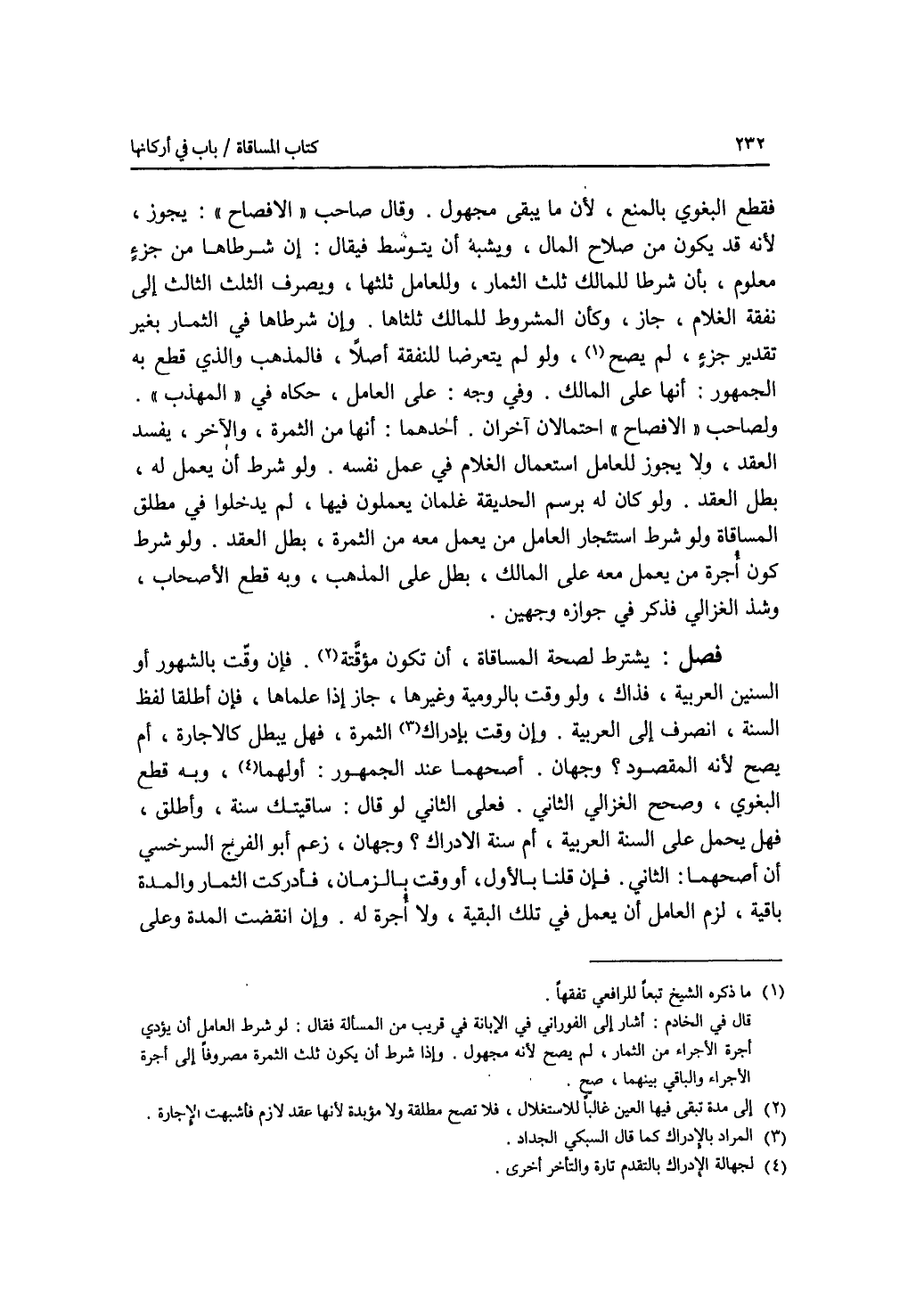 فقطع البغوي بالمنع، لان ما يبقى مجهول. وقال صاحب الافصاح: يجوز، لانه قد يكون من صلاح المال، ويشبه أن يتوسط فيقال: إن شرطاها من جزء معلوم، بأن شرطا للمالك ثلث الثمار، وللعامل ثلثها، ويصرف الثلث الثالث إلى نفقة الغلام. جاز، وكأن المشروط للمالك ثلثاها. وإن شرطاها في الثمار بغير تقدير جزء لم يصح. ولو لم يتعرضا للنفقة أصلا، فالمذهب والذي قطع به الجمهور: أنها على المالك. وفي وجه: على العامل، حكاه في المهذب. ولصاحب الافصاح احتمالان آخران. أحدهما: أنها من الثمرة، والآخر، يفسد العقد، ولا يجوز للعامل استعمال الغلام في عمل نفسه. ولو شرط أن يعمل له، بطل العقد. ولو كان برسم الحديقة غلمان يعملون فيها، لم يدخلوا في مطلق المساقاة. ولو شرط استئجار العامل من يعمل معه من الثمرة، بطل العقد. ولو شرط كون أجرة من يعمل معه على المالك، بطل على المذهب، وبه قطع الاصحاب، وشذ الغزالي، فذكر في جوازه وجهين. فصل يشترط لصحة المساقاة، أن تكون مؤقتة. فإن وقت بالشهور أو السنين العربية، فذاك، ولو وقت بالرومية وغيرها، جاز إذا علماها، فإن أطلقا لفظ السنة، انصرف إلى العربية. وإن وقت بادراك الثمرة، فهل يبطل كالاجارة، أم يصح لانه المقصود ؟ وجهان. أصحهما عند الجمهور: أولهما، وبه قطع البغوي، وصحح الغزالي الثاني. فعلى الثاني لو قال: ساقيتك سنة، وأطلق، فهل يحمل على السنة العربية، أم سنة الادراك ؟ وجهان، زعم أبو الفرج السرخسي (أن) أصحهما: الثاني. فإن قلنا بالاول، أو وقت بالزمان، فأدركت الثمار والمدة باقية، لزم العامل أن يعمل في تلك البقية، ولا أجرة له. وإن انقضت المدة وعلى