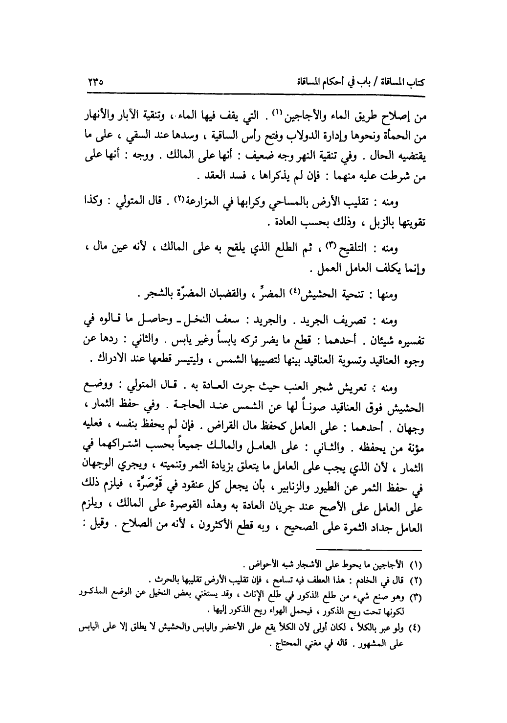 من إصلاح طريق المال والاجاجين التي يقف فيها الماء، وتنقية الآبار والانهار من الحمأة ونحوها. وإدارة الدولاب وفتح رأس الساقية، وسدها عند السقي، على ما يقتضيه الحال. وفي تنقية النهر وجه ضعيف: أنها على المالك. ووجه: أنها على من شرطت عليه منهما. فإن لم يذكراها، فسد العقد. ومنه: تقليب الارض بالمساحي وكرابها في المزارعة. قال المتولي: وكذا تقويتها بالزبل، وذلك بحسب العادة. ومنه: التلقيح، ثم الطلع الذي يلقح به على المالك، لانه عين مال، وإنما يكلف العامل العمل. ومنها: تنحية الحذيش المضر، والقضبان المضرة بالشجر. ومنه: تصريف الجريد. - والجريد: سعف النخل -. وحاصل ما قالوه في تفسيره شيئان. أحدهما: قطع ما يضر تركه يابسا وغير يابس. والثاني: ردها عن وجوه العناقيد بينها لتصيبها الشمس، وليتيسر قطعها عند الادراك. ومنه: تعريش شجر العنب حيث جرت العادة به. قال المتولي: ووضع الحشيش فوق العناقيد صونا عن الشمس عند الحاجة. وفي حفظ الثمار، وجهان. أحدهما: على العامل كحفظ مال القراض. فإن لم يحفظ بنفسه، فعليه مؤنة من يحفظه. والثاني: على العامل والمالك جميعا بحسب اشتراكهما في الثمار، لان الذي يجب على العامل ما يتعلق بزيادة الثمر وتنميته، ويجري الوجهان في حفظ الثمر عن الطيور والزنانير، بأن يجعل كل عنقود في قوصرة، فيلزم ذلك على العامل على الاصح عند جريان العادة (به) وهذه القوصرة على المالك، ويلزم العامل جداد الثمرة على الصحيح، وبه قطع الاكثرون، لانه من الصلاح. وقيل:
