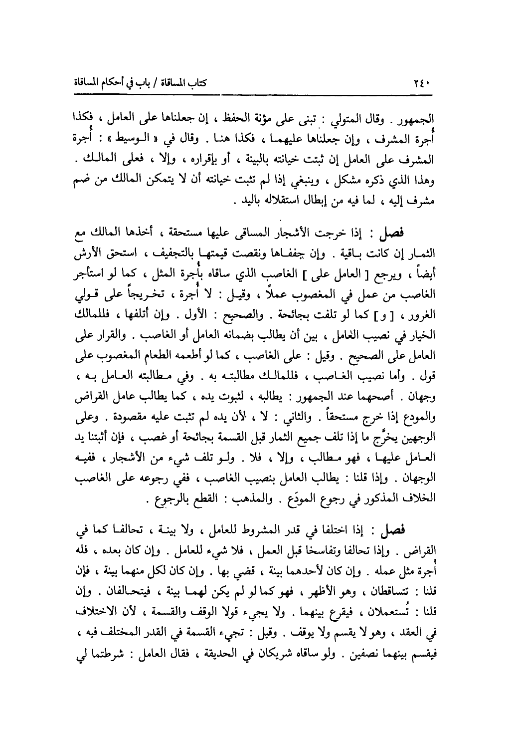 فصل إذا خرجت الاشجار المساقى عليها مستحقة، أخذها المالك مع الثمار إن كانت باقية. وإن جففاها ونقصت قيمتها بالتجفيف، استحق الارش أيضا، ويرجع العامل على الغاصب الذي ساقاه بأجرة المثل، كما لو استأجر الغاصب من عمل في المغصوب عملا، وقيل: لا أجرة، تخريجا على قولي الغرور، وكما لو تلفت بجانحة. والصحيح: الاول. وإن أتلفها، فللمالك الخيار في نصيب العامل، بين أن يطالب بضمانه العامل أو الغاصب. والقرار على العامل على الصحيح. وقيل: على الغاصب، كما لو أطعمه الطعام المغصوب على قول. وأما نصيب الغاصب، فللمالك مطالبته به. وفي مطالبته العامل به، وجهان. أصحهما عند الجمهور: يطالبه، لثبوت يده لم، كما يطالب عامل القراض والمودع إذا خرج مستحقا. والثاني: لا، لان يده تثبت عليه مقصودة. وعلى الوجهين يخرج ما إذا تلف جميع الثمار قبل القسمة بجائحة أو غصب، فان ثبتنا يد العامل عليها، فهو مطالب، وإلا، فلا. ولو تلف شئ من الاشجار، ففيه الوجهان. وإذا قلنا: يطالب العامل بنصيب الغاصب، ففي رجوعه على الغاصب الخلاف المذكور في رجوع المودع. والمذهب: القطع بالرجوع.