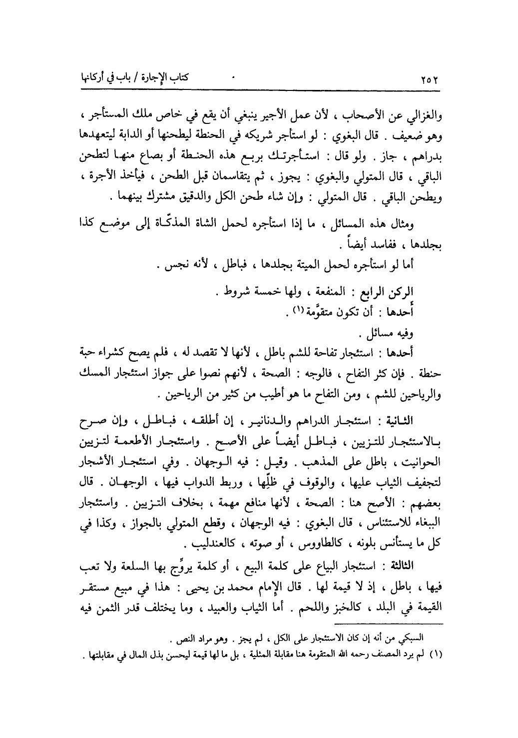 والغزالي عن الاصحاب، لان عمل الاجير ينبغي أن يقع في خاص ملك المستأجر، وهو ضعيف. قال البغوي: لو استأجر شريكه في الحنطة ليطحنها أو الدابة ليتعهدها بدراهم، جاز. ولو قال: استأجرتك بربع هذه الحنطة أو بصاع منها لتطحن الباقي، قال المتولي والبغوي: يجوز، ثم يتقاسمان قبل الطحن، فيأخذ الاجرة، ويطحن الباقي. قال المتولي: وإن شاء طحن الكل والدقيق مشترك بينهما. ومثال هذه المسائل، ما إذا استأجره لحمل الشاة المذكاة إلى موضع كذا بجلدها، ففاسد أيضا. أما لو استأجره لحمل الميتة بجلدها، فباطل، لانه نجس. الركن الرابع: المنفعة، ولها خمسة شروط. أحدها: أن تكون متقومة وفيه مسائل. أحدها: استئجار تفاحة للشم باطل، لانها لا تقصد له، فلم يصح كشراء حبة حنطة. فإن كثر التفاح، فالوجه: الصحة، لانهم نصوا على جواز استئجار المسك والرياحين للشم، ومن التفاح ما هو أطيب من كثير من الرياحين. الثانية: استئجار الدراهم والدنانير، إن أطلقه، فباطل، وإن صرح بالاستئجار للتزيين، فباطل أيضا على الاصح. واستئجار الاطعمة لتزيين الحوانيت، باطل على المذهب. وقيل: فيه الوجهان. وفي استئجار الاشجار لتجفيف الثياب عليها، والوقوف في ظلها، وربط الدواب فيها، الوجهان. قال بعضهم: الاصح هنا: الصحة، لانها منافع مهمة، بخلاف التزيين. واستئجار الببغاء للاستئناس، قال البغوي: فيه الوجهان، وقطع المتولي بالجواز، وكذا في كل ما يستأنس بلونه، كالطاووس، أو صوته، كالعندليب. الثالثة: استئجار البياع على كلمة البيع، أو كلمة يروج بها السلعة ولا تعب فيها، باطل، إذ لا قيمة لها. قال الامام محمد بن يحيى: هذا في مبيع مستقر القيمة في البلد، كالخبز واللحم. أما الثياب والعبيد، وما يختلف قدر الثمن فيه