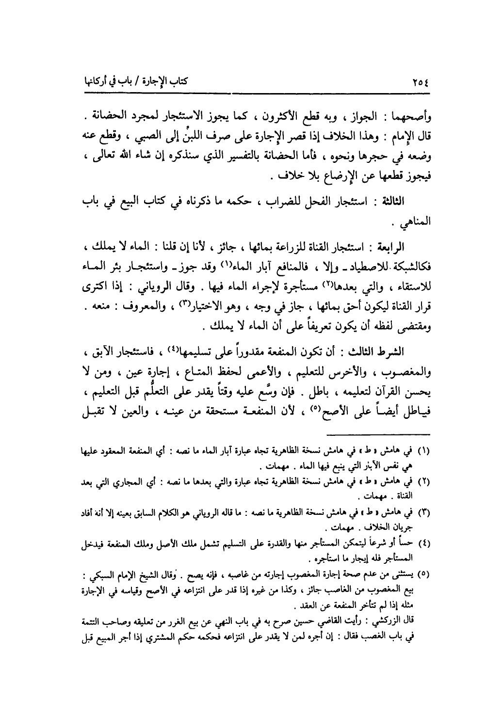 وأصحهما: الجواز، وبه قطع الاكثرون، كما يجوز الاستئجار لمجرد الحضانة. قال الامام: وهذا الخلاف إذا قصر الاجارة على صرف اللبن إلى الصبي، وقطع عنه وضعه في حجرها ونحوه، فأما الحضانة بالتفسير الذي سنذكره إن شاء الله تعالى، فيجوز قطعها عن الارضاع بلا خلاف. الثالثة: استئجار الفحل للضراب، حكمه ما ذكرناه في كتاب البيع في باب المناهي. الرابعة: استئجار القناة للزراعة بمائها، جائز، لانا إن قلنا: الماء لا يملك، فكالشبكة للاصطياد - وإلا، فالمنافع آبار الماء وقد جوز واستئجار بئر الماء للاستقاء والتي بعدها مستأجرة لاجراء الماء فيها. وقال الروياني: إذا اكترى قرار القناة ليكون أحق بمائها، جاز في وجه، وهو الاختيار. والمعروف: منعه. ومقتضى لفظه أن يكون تعريفا على أن الماء لا يملك. الشرط الثالث: أن تكون المنفعة مقدورا على تسليمها، فاستئجار الآبق، والمغصوب، والاخرس للتعليم، والاعمى لحفظ المتاع، إجارة عين، ومن لا يحسن القرآن لتعليمه، باطل. فإن وسع عليه وقتا يقدر على التعلم قبل التعليم، فباطل أيضا على الاصح، لان المنفعة مستحقة من عينه، والعين لا تقبل