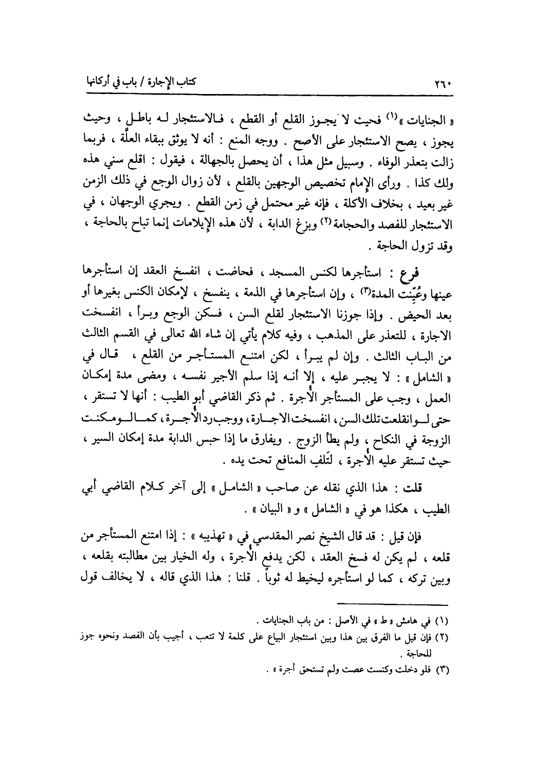 الجنايات فحيث لا يجوز القلع أو القطع، فالاستئجار له باطل، وحيث يجوز، يصح الاستئجار على الاصح. ووجه المنع: أنه لا يوثق ببقاء العلب، فربما زالت بتعذر الوفاء. وسبيل مثل هذا، أن يحصل بالجعالة، فيقول: اقلع سني هذه ولك كذا. ورأى الامام تخصيص الوجهين بالقلع، لان زوال الوجع في ذلك الزمن غير بعيد، بخلاف الاكلة، فإنه غير محتمل في زمن القطع. ويجري الوجهان، في الاستئجار للفصد والحجامة وبزغ الدابة، لان هذه الايلامات إنما تباح بالحاجة، وقد تزول الحاجة. فرع استأجرها لكنس المسجد، فحاضت، انفسخ العقد إن أستأجر ها عينها وعينت المدة. وإن استأجر (ها) في الذمة، لم ينفسخ، لامكان الكنس بغيرها أو بعد الحيض. وإذا جوزنا الاستئجار لقلع السن، فسكن الوجع وبرأ، انفسخت الاجارة، للتعذر على المذهب، وفيه كلام يأتي إن شاء الله تعالى في القسم الثالث من الباب الثالث. وإن لم يبرأ، لكن امتنع المستأجر من القلع، قال في الشامل: لا يجبر عليه، إلا أنه إذا سلم الاجير نفسه، ومضى مدة إمكان العمل، وجب على المستأجر الاجرة. ثم ذكر القاضي أبو الطيب: أنها لا تستقر، حتى لو انقلعت تلك السن، انفسخت الاجارة، ووجب رد الاجرة، كما لو مكنت الزوجة في النكاح، ولم يطأ الزوج. ويفارق ما إذا حبس الدابة مدة إمكان السير، حيث تستقر عليه الاجرة، لتلف المنافع تحت يده. قلت: هذا الذي نقله عن صاحب الشامل إلى آخر كلام القاضي أبي الطيب، هكذا هو في الشامل والبيان. فإن قيل: قد قال الشيخ نصر المقدسي في تهذيبه: إذا امتنع المستأجر من قلعه، لم يكن له فسخ العقد، لكن يدفع الاجرة، وله الخيار بين مطالبته بقلعه، وبين تركه، كما لو استأجره ليخيط له ثوبا. قلنا: هذا الذي قاله، لا يخالف قول