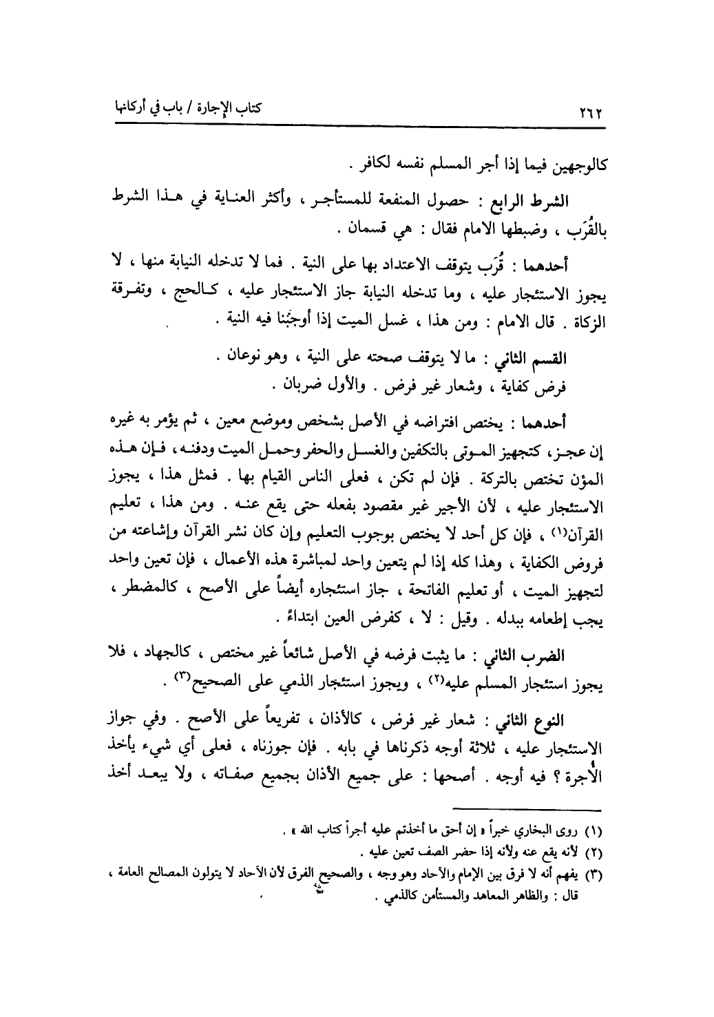 كالوجهين فيما إذا أجر المسلم نفسه لكافر. الشرط الرابع: حصول المنفعة للمستأجر، وأكثر العناية في هذا الشرط بالقرب، وضبطها الامام فقال: هي قسان. أحدهما: قرب يتوقف الاعتداد بها على النية. فما لا تدخله النيابة منها، لا يجوز الاستئجار عليه، وما تدخله النيابة، جاز الاستئجار عليه، كالحج، وتفرقة الزكاة. قال الامام: ومن هذا، غسل الميت إذا أوجبنا فيه النية. القسم الثاني: ما لا تتوقف صحته على النية، وهو نوعان. فرض كفاية، وشعار غير فرض. والاول ضربان. أحدهما: يختص افتراضه في الاصل بشخص وموضع معين، ثم يؤمر به غيره إن عجز، كتجهيز الموتى بالتكفين والغسل والحفر وحمل الميت ودفنه، فإن هذه المؤن تختص بالتركة. فإن لم تكن، فعلى الناس القيام بها. فمثل هذا يجوز الاستئجار عليه، لآن الاجير غير مقصود بفعله حتى يقع عنه. ومن هذا، تعليم القرآن، فإن كل أحد لا يختص بوجوب التعليم وإن كان نشر القرآن وإشاعته من فروض الكفاية، وهذا كله إذا لم يتعين واحد لمباشرة هذه الاعمال، فإن تعين واحد لتجهيز الميت، أو تعليم الفاتحة، جاز استئجاره أيضا على الاصح، كالمضطر، يجب إطعامه ببدله. وقيل: لا، كفرض العين ابتداء. الضرب الثاني: ما يثبت فرضه في الاصل شائعا غير مختص، كالجهاد، فلا يجوز استئجار المسلم عليه، ويجوز استئجار الذمي على الصحيح. النوع الثاني: شعار غير فرض، كالاذان، تفريعا على الاصح. وفي جواز الاستئجار المسلم عليه، ثلاثة أوجه ذكرناها في بابه. فإن جوزنا، فعلى أي شئ يأخذ الاجرة ؟ فيه أوجه. أصحها: على جميع الاذان بجميع صفاته، ولا يبعد أخذ