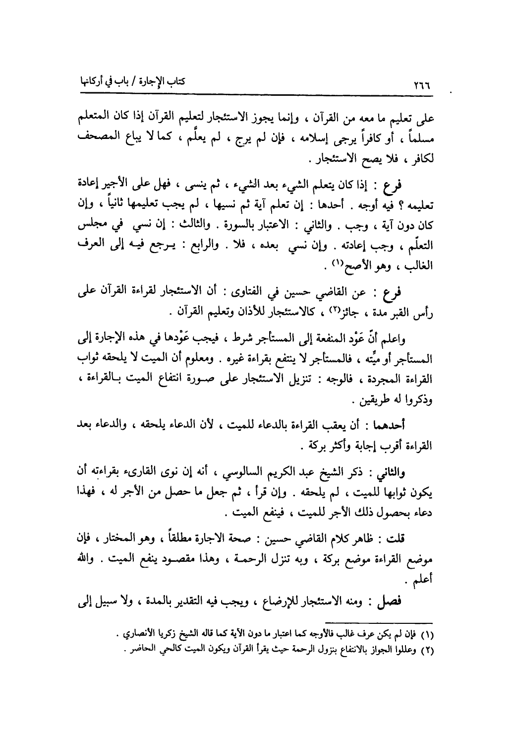 على تعليم ما معه من القرآن، وإنما يجوز الاستئجار لتعليم القرآن إذا كان المتعلم مسلما، أو كافرا يرجى إسلامه، فإن لم يرج، لم يعلم، كما لا يباع المصحف لكافر، فلا يصح الاستئجار. فرع إذا كان يتعلم الشئ بعد الشئ، ثم ينسى، فهل على الاجير إعادة تعليمه ؟ فيه أوجه. أحدها: إن تعلم آية ثم نسيها، لم يجب تعليمها ثانيا، وإن كان دون آية، وجب العرف والثاني: الاعتبار بالسورة والثالث: إن نسي في مجلس التعليم، وجب اعادته. وإن نسي بعده، فلا. والرابع: يرجع فيه إلى العزف الغالب، وهو الاصح. فرع عن القاضي حسين في الفتاوى: أن الاستئجار لقراءة القرآن على رأس القبر مدة، جائز، كالاستئجار للاذان وتعليم القرآن. واعلم أن عود المنفعة إلى المستأجر شرط، فيجب عودها في هذه الاجارة إلى المستأجر أو ميته، فالمستأجر لا ينتفع بقراءة غيره. ومعلوم أن الميت لا يلحقه ثواب القراءة المجردة، فالوجه: تنزيل الاستئجار على صورة انتفاع الميت بالقراءة. وذكروا له طريقين. أحدهما: أن يعقب القراءة بالدعاء للميت، لان الدعاء يلحقه، والدعاء بعد القراءة أقرب إجابة وأكثر بركة. والثاني: ذكر الشيخ عبد الكريم السالوسي، أنه إن نوى القارئ بقراءته أن يكون ثوابها للميت، لم يلحقه. وإن قرأ، ثم جعل ما حصل من الاجر له، فهذا دعاء بحصول ذلك الاجر للميت، فينفع الميت. قلت: ظاهر كلام القاضي حسين: صحة الاجارة مطلقا، وهو المختار، فإن موضع القراءة موضع بركة، وبه تنزل الرحمة، وهذا مقصود ينفع الميت. والله أعلم فصل ومنه الاستئجار للارضاع، ويجب فيه التقدير بالمدة، ولا سبيل إلى