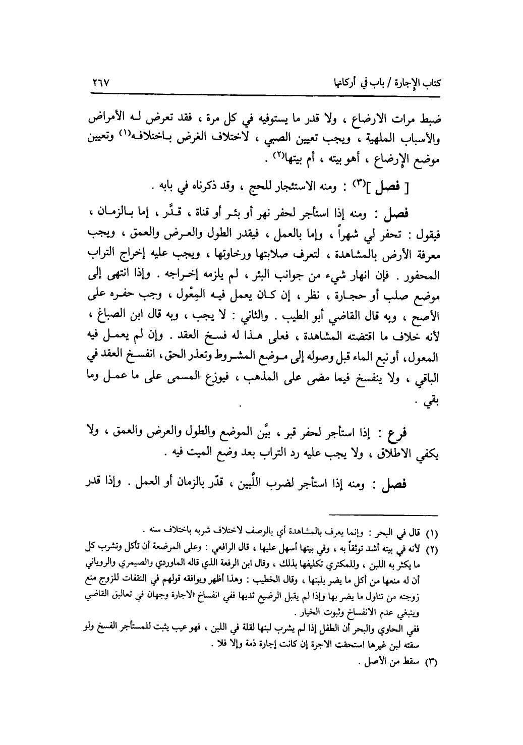 ضبط مرات الارضاع، ولا قدر ما يستوفيه في كل مرة، فقد تعرض له الامراض والاسباب الملهية، ويجب تعيين الصبي، لاختلاف الغرض باختلافه، وتعيين موضع الارضاع، أهو بيته، أم بيتها. فصل ومنه الاستئجار للجج، وقد ذكرناه في بابه. فصل ومنه إذا استأجر لحفر نهر أو بئر أو قناة، قدر، إما بالزمان، فيقول: تحفر لي شهرا، وإما بالعمل، فيقدر الطول والعرض والعمق، ويجب معرفة الارض بالمشاهدة، لتعرف صلابتها ورخاوتها، ويجب عليه إخراج التراب المحفور. فإن انهار شئ من جوانب البئر، لم يلزمه إخراجه. وإذا انتهى إلى موضع صلب أو حجارة، نظر، إن كان يعمل فيه المعول، وجب حفره على الاصح، وبه قال القاضي أبو الطيب. والثاني: لا يجب، وبه قال ابن الصباغ، لانه خلاف ما اقتضته المشاهدة، فعلى هذا له فسخ العقد. وإن لم يعمل فيه المعول، أو نبع الماء قبل وصوله إلى موضع المشروط وتعذر الحق، انفسخ العقد في الباقي، ولا ينفسخ فيما مضى على المذهب، فيوزع المسمى على ما عمل وما بقي. فرع إذا استأجر لحفر قبر، بين الموضع والطول والعرض والعمق، ولا يكفي الاطلاق، ولا يجب عليه رد التراب بعد وضع الميت فيه. فصل ومنه إذا استأجر لضرب اللبن، قدر بالزمان أو العمل. وإذا قدر