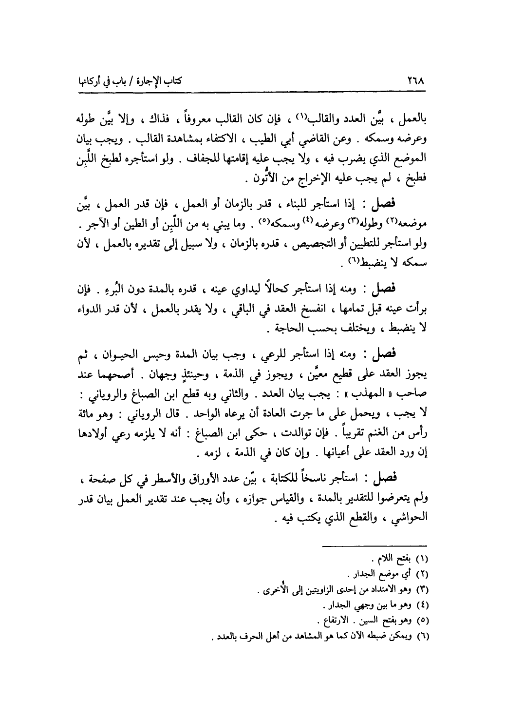 بالعمل، بين العدد والقالب. فإن كان القالب معروفا، فذاك، وإلا بين طوله وعرضه وسمكه. وعن القاضي أبي الطيب، الاكتفاء بمشاهدة القالب. ويجب بيان الموضع الذي يضرب فيه، ولا يجب عليه إقامتها للجفاف. ولو استأجره لطبخ اللبن فطبخ، لم يجب عليه الاخراج من الاتون. فصل إذا استأجر للبناء، قدر بالزمان أو العمل، فإن قدر بالعمل، بين موضعه وطوله وعرضه وسمكه وما يبنى به من اللبن أو الطين أو الآجر. ولو استأجر للتطيين أو التجصيص، قدر بالزمان، ولا سبيل إلى تقديره بالعمل، لان سمكه لا ينضبط. فصل ومنه إذا استأجر كحالا ليداوي عينه، قدره بالمدة دون البرء. فإن برأت عينه قبل تمامها، انفسخ العقد في الباقي، ولا يقدر بالعمل، لان قدر الدواء لا ينضبط ويختلف بحسب الحاجة. فصل ومنه إذا استأجر للرعي، وجب بيان المدة وحبس الحيوان، ثم يجوز العقد على قطيع معين، ويجوز في الذمة، وحينئذ وجهان. أصحهما عند صاحب المهذب: يجب بيان العدد. والثاني وبه قطع ابن الصباغ والروياني: لا يجب، ويحمل على ما جرت العادة أن يرعاه الواحد. قال الروياني: وهو مائة رأس من الغنم تقريبا. فإن توالدت، حكى ابن الصباغ: أنه لا يلزمه رعي أولادها إن ورد العقد على أعيانها. وإن كان في الذمة، لزمه. فصل استأجر ناسخا للكتابة، بين عدد الاوراق والاسطر في كل صفحة، ولم يتعرضوا للتقدير بالمدة، والقياس جوازه، وأن يجب ند تقدير العمل بيان قدر الحواشي، والقطع الذي يكتب فيه.