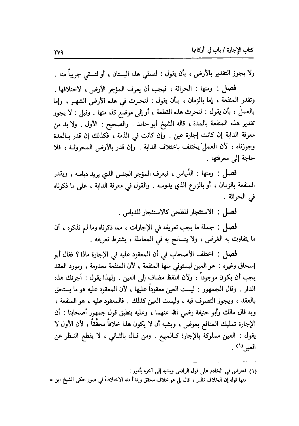 ولا يجوز التقدير بالارض، بأن يقول: لتسقي هذا البستان، أو لتسقي جريبا منه. فصل ومنها: الحراثة، فيجب أن يعرف المؤجر الارض، لاختلافها.. وتقدر المنفعة، إما بالزمان، بأن يقول: لتحرث في هذه الارض الشهر، وإما بالعمل، بأن يقول: لتحرث هذه القطعة، أو إلى موضع كذا منها. وقيل: لا يجوز تقدير هذه المنفعة بالمدة، قاله الشيخ أبو حامد. والصحيح: الاول. ولا بد من معرفة الدابة إن كانت إجارة عين. وإن كانت في الذمة، فكذلك إن قدر بالمدة وجوزناه، لان العمل يختلف باختلاف الدابة. وإن قدر بالارض المحروثة، فلا حاجة إلى معرفتها. فصل ومنها: الدياس، فيعرف المؤجر الجنس الذي يريد دياسه، ويقدر المنفعة بالزمان، أو بالزرع الذي يدوسه. والقول في معرفة الدابة، على ما ذكرناه في الحراثة. فصل الاستئجار للطحن كالاستئجار للدياس. فصل جملة ما يجب تعريفه في الاجارات، مما ذكرناه وما لم نذكره، أن ما يتفاوت به الغرض، ولا يتسامح به في المعاملة، يشترط تعريفه. فصل اختلف الاصحاب في أن المعقود عليه في الاجارة ماذا ؟ فقال أبو إسحاق وغيره: هو العين ليستوفي منها المنفعة، لان المنفعة معدومة، ومورد العقد يجب أن يكون موجودا، ولان اللفظ مضاف إلى العين. ولهذا يقول: أجرتك هذه الدار. وقال الجمهور: ليست العين معقودا عليها، لان المعقود عليه هو ما يستحق بالعقد، ويجوز التصرف فيه، وليست العين كذلك. فالمعقود عليه، هو المنفعة، وبه قال مالك وأبو حنيفة رضي الله عنهما، وعليه ينطبق قول جمهور أصحابنا: أن الاجارة تمليك المنافع بعوض، ويشبه أن لا يكون هذا خلافا محققا، لان الاول لا يقول: العين مملوكة بالاجارة كالمبيع. ومن قال بالثاني، لا يقطع النظر عن العين.
