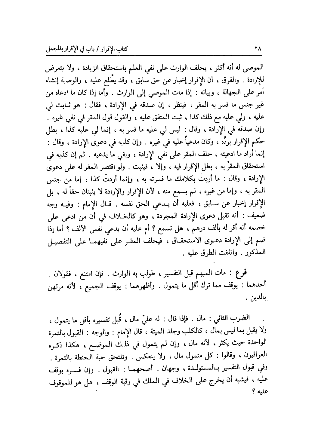 الموصى له أنه أكثر يحلف الوارث على نفي العلم باستحقاق الزيادة، ولا يتعرض للارادة. والفرق، أن الاقرار إخبار عن حق سابق، وقد يطلع عليه، والوصية إنشاء أمر على الجهالة، وبيانه: إذا مات (الموصي) إلى الوارث. وأما إذا كان ما ادعاه من غير جنس ما فسر به المقر، فينظر، إن صدقه في الارادة، فقال: هو ثابت لي عليه، ولي عليه مع ذلك كذا، ثبت المتفق عليه، والقول قول المقر في نفي غيره. وإن صدقه في الارادة، وقال: ليس لي عليه ما فسر (به)، إنما لي عليه كذا، بطل حكم الاقرار برده، وكان مدعيا عليه في غيره. وإن كذبه في دعوى الارادة، وقال: إنما أراد ما ادعيته، حلف المقر على نفي الارادة، وبقي ما يدعيه. ثم إن كذبه في استحقاق المقر به، بطل الاقرار فيه، وإلا، فيثبت. ولو اقتصر المقر له على دعوى الارادة، وقال: ما أردت بكلامك ما فسرته به، وإنما أردت كذا، إما من جنس المقر به، وإما من غيره، لم يسمع منه، لان الاقرار والارادة لا يثبتان حقا له، بل الاقرار إخبار عن سابق، فعليه أن يدعي الحق نفسه. قال الامام: وفيه وجه ضعيف: أنه تقبل دعوى الارادة المجردة، وهو كالخلاف في أن من ادعى على خصمه أنه أقر له بألف درهم، هل تسمع ؟ أم عليه أن يدعي نفس الالف ؟ أما إذا ضم إلى الارادة دعوى الاستحقاق، فيحلف المقر على نفيهما على التفصيل المذكور. واتفقت الطرق عليه. فرع مات المبهم قبل التفسير، طولب به الوارث. فإن امتنع، فقولان. أحدهما: يوقف مما ترك أقل ما يتمول. وأظهرهما: يوقف الجميع، لانه مرتهن بالدين. الضرب الثاني: مال. فإذا قال: له علي مال، قبل تفسيره بأقل ما يتمول، ولا يقبل بما ليس بمال، كالكلب وجلد الميتة، قال الامام: والوجه: القبول بالتمرة الواحدة حيث يكثر، لانه مال، وإن لم يتمول في ذلك الموضع، هكذا ذكره العراقيون، وقالوا: كل متمول مال، ولا ينعكس. وتلتحق حبة الحنطة بالتمرة. وفي قبول التفسير بالمستولدة، وجهان. أصحهما: القبول. وإن فسره بوقف عليه، فيشبه أن يخرج على الخلاف في الملك في رقبة الوقف، هل هو للموقوف عليه ؟