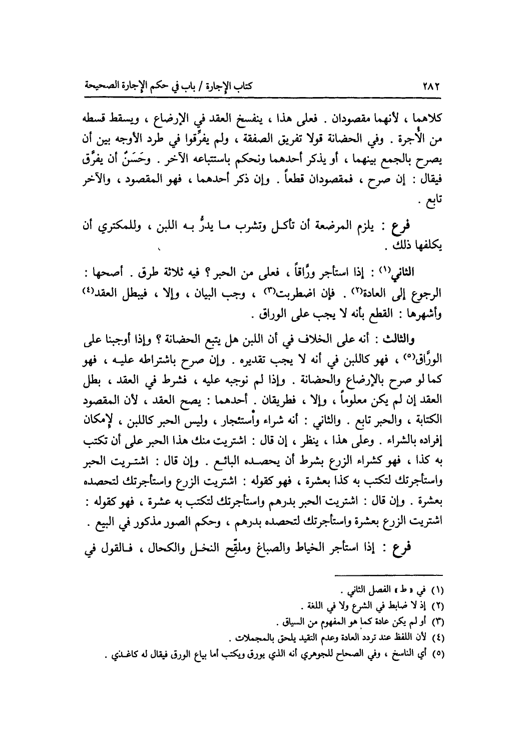 كلاهما، لانهما مقصودان. فعلى هذا، ينفسخ العقد في الارضاع، ويسقط قسطه من الاجرة. وفي الحضانة قولا تفريق الصفقة، ولم يفرقوا في طرد الاوجه بين أن يصرح بالجمع بينهما، أو يذكر أحدهما ونحكم باستتباعه الآخر. وحسن أن يفرق فيقال: إن صرح، فمقصودان قطعا. وإن ذكر أحدهما، فهو المقصود، والآخر تابع. فرع يلزم المرضعة أن تأكل وتشرب ما يدر به اللبن، وللمكتري أن يكلفها ذلك. الثاني: إذا استأجر وراقا، فعلى من الحبر ؟ فيه ثلاثة طرق. أصحها: الرجوع إلى العادة. فإن اضطربت، وجب البيان، وإلا فيبطل العقد. وأشهرها: القطع بأنه لا يجب على الوراق. والثالث: أنه على الخلاف في أن اللبن هل يتبع الحضانة 0 وإذا أوجبنا على الوراق، فهو كاللبن في أنه لا يجب تقديره. وإن صرح باشتراطه عليه، فهو كما لو صرح بالارضاع والحضانة. وإذا لم نوجبه عليه، فشرط في العقد، بطل العقد إن لم يكن معلوما، وإلا، فطريقان. أحدهما: يصح العقد، لان المقصود الكتابة، والحبر تابع. والثاني: أنه شراء واستئجار، وليس الحبر كاللبن، لامكان إفراده بالشراء. وعلى هذا، ينظر، فإن قال: اشتريت منك هذا الحبر على أن تكتب به كذا، فهو كشراء الزرع بشرط أن يحصده البائع. وإن قال: اشتريت الحبر واستأجرتك لتكتب به كذا بعشرة، فهو كقوله: اشتريت الزرع واستأجرتك لتحصده بعشرة. وإن قال: اشتريت الحبر بدرهم واستأجرتك لتكتب به بعشرة، فهو كقوله: اشتريت الزرع بعشرة واستأجرتك لتحصده بدرهم، وحكم الصور مذكور في البيع. فرع إذا استأجر الخياط والصباغ وملقح النخل والكحال، فالقول في