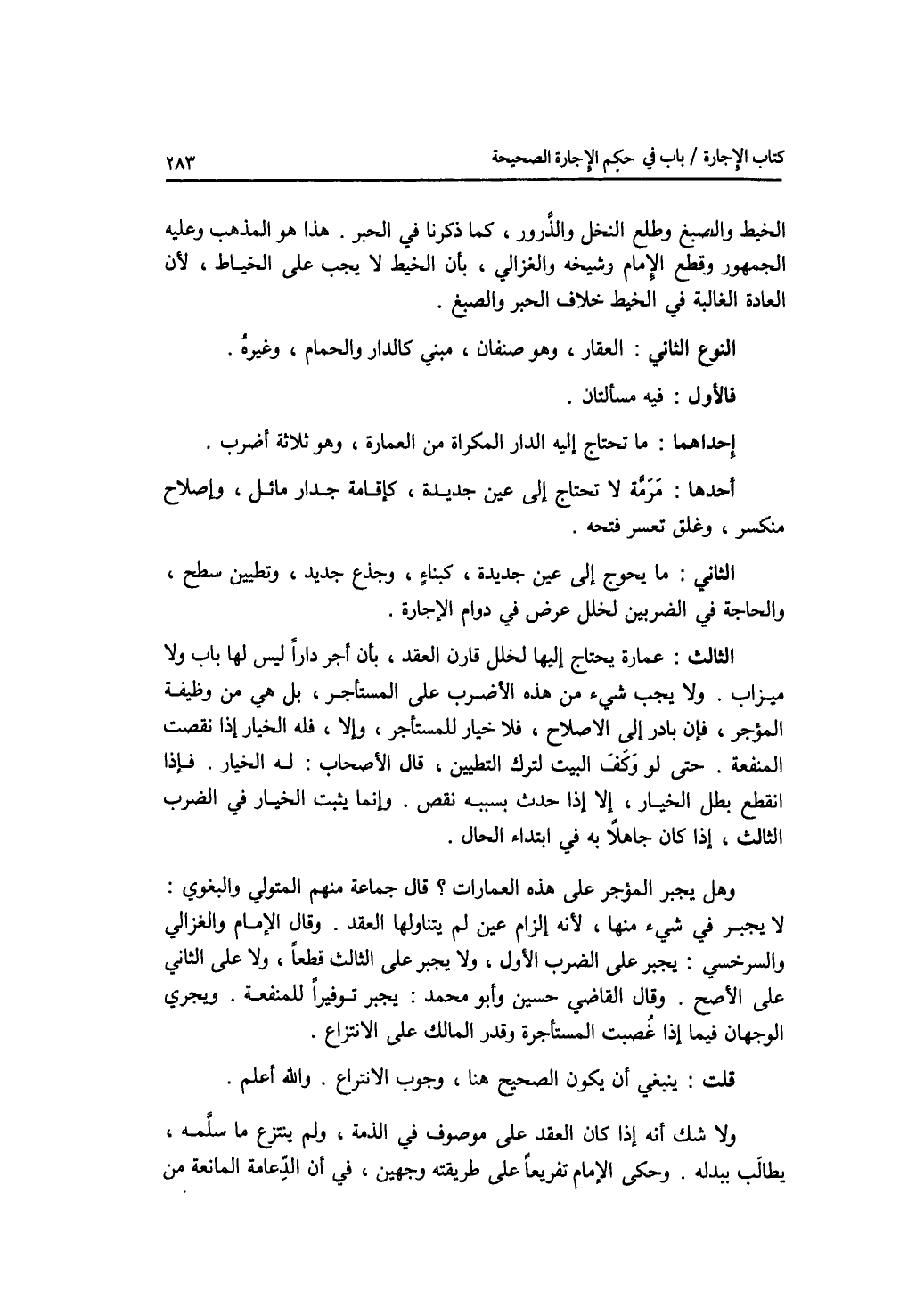 الخيط والصبغ وطلع النخل والذرور، كما ذكرنا في الحبر. هذا هو المذهب وعليه الجمهور وقطع الامام وشيخه والغزالي، بأن الخيط لا يجب على الخياط، لان العادة الغالبة في الخيط خلاف الحبر والصبغ. النوع الثاني: العقار، وهو صنفان، مبني كالدار والحمام، وغيره. فالاول: فيه مسألتان. إحداهما: ما تحتاج إليه الدار المكراة من العمارة، وهو ثلاثة أضرب أحدها: مرمة لا تحتاج إلى عين جديدة، كاقامة جدار مائل، وإصلاح منكسر، وغلق تعسر فتحه. والثاني: ما يحوج إلى عين جديدة، كبناء، وجذع جديد، وتطيين سطح، والحاجة في الضربين لخلل عرض في دوام الاجارة. الثالث: عمارة يحتاج إليها لخلل قارن العقد، بأن أجر دارا ليس لها باب ولا ميزاب. ولا يجب شئ من هذه الاضرب على المستأجر، بل هي من وظيفة المؤجر، فإن بادر إلى الاصلاح، فلا خيار للمستأجر، وإلا، فله الخيار إذا نقصت المنفعة. حتلو وكف البيت لترك التطيين، قال الاصحاب: له الخيار. فإذا انقطع بطل الخيار، إلا إذا حدث بسببه نقص. وإنما يثبت الخيار في الضرب الثالث، إذا كان جاهلا به في ابتداء الحال. وهل يجبر المؤجر على هذه العمارات ؟ قال جماعة منهم المتولي والبغوي: لا يجبر في شئ منها، لانه إلزام عين لم يتناولها العقد. وقال الامام والغزالي والسرخسي: يجبر على الضرب الاول، ولا يجبر على الثالث قطعا، ولا على الثاني على الاصح. وقال القاضي حسين وأبو محمد: يجبر توفيرا للمنفعة. ويجري الوجهان فيما إذا غصبت المستأجرة وقدر المالك على الانتزاع. قلت: ينبغي أن يكون الصحيح هنا، وجوب الانتزاع. والله أعلم ولا شك أنه إذا كان العقد على موصوف في الذمة، ولم ينتزع ما سلمه، يطالب ببدله. وحكى الامام تفريعا على طريقته وجهين، في أن الدعامة المانعة من