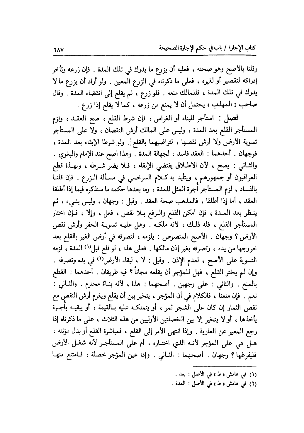فصل استأجر للبناء أو الغراس، فإن شرط القلع، صح العقد، ولزم المستأجر القلع بعد المدة، وليس على المالك أرش النقصان، ولا على المستأجر تسوية الارض ولا أرش نقصها، لتراضيهما بالقلع. ولو شرطا الابقاء بعد المدة، فوجهان. أحدهما: العقد فاسد، لجهالة المدة. وهذا أصح عند الامام والبغوي. والثاني: يصح، لان الاطلاق يقتضي الابقاء، فلا يضر شرطه، وبهذا قطع العراقيون أو جمهورهم، ويتأيد به كلام السرخسي في مسألة الزرع. فإن قلنا بالفساد، لزم المستأجر أجرة المثل للمدة، وما بعدها حكمه ما سنذكره فيما إذا أطلقا العقد. أما إذا أطلقا، فالمذهب صحة العقد. وقيل: وجهان، وليس بشئ، ثم ينظر بعد المدة، فإن أمكن القلع والرفع بلا نقص، فعل، وإلا، فإن اختار المستأجر القلع، فله ذلك، لانه ملكه. وهل عليه تسوية الحفر وأرش نقص الارض ؟ وجهان. الاصح المنصوص: يلزمه، لتصرفه في أرذ الغير بالقلع بعد خروجها من يده، وتصرفه بغير إذن مالكها. فعلى هذا، لو قلع قبل المدة، لزمه التسوية على الاصح، لعدم الاذن. وقيل: لا، لبقاء الارض في يده وتصرفه. وإن لم يختر القلع، فهل للمؤجر أن يقلعه مجانا ؟ فيه طريقان. أحدهما: القطع بالمنع. والثاني: على وجهين. أصحهما: هذا، لانه بناء محترم. والثاني: نعم. فإن منعنا، فالكلام في أن المؤخر، يتخير بين أن يقلع ويغرم أرش النقص مع نقص الثمار إن كان على الشجر ثمر، أو يتملكه عليه بالقيمة، أو يبقية بأجرة يأخذها، أو لا يتخير إلا بين الخصلتين الاوليين من هذه الثلاث، على ما ذكرناه إذا رجع المعير عن العارية. وإذا انتهى الامر إلى القلع، فمباشرة القلع أو بدل مؤنته، هل هي على المؤجر لانه الذي اختاره، أم على المستأجر لانه شغل الارض فليفرغها ؟ وجهان. أصحهما: الثاني. وإذا عين المؤجر خصلة، فامتنع منها