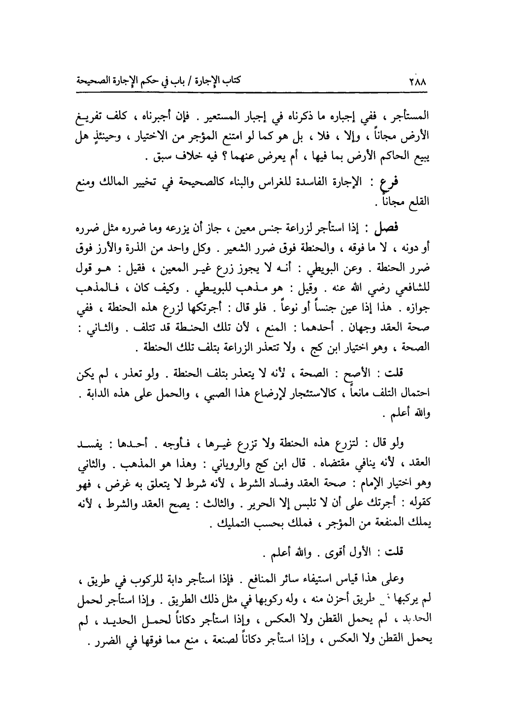 المستأجر، ففي إجباره ما ذكرناه في إجبار المستعير. فإن أجبرناه، كلف تفريغ الارض مجانا، وإلا، فلا، بل هو كما لو امتنع المؤجر من الاختيار، وحينئذ هل يبيع الحاكم الارض بما فيها، أم يعرض عنهما ؟ فيه خلاف سبق. فرع الاجارة الفاسدة للغراس والبناء كالصحيحة في تخيير المالك ومنع القلع مجانا. فصل إذا استأجر لزراعة جنس معين، جاز أن يزرعه وما ضرره مثل ضرره أو دونه، لا ما فوقه، والحنطة فوق ضرر الشعير. وكل واحد من الذرة والارز فوق ضرر الحنطة. وعن البويطي: أنه لا يجوز غير زرع المعين، فقيل: هو قول للشافعي رضي الله عنه. وقيل: هو مذهب للبويطي. وكيف كان، فالمذهب جوازه. هذا إذا عين جنسا أو نوعا. فلو قال: أجرتكها لزرع هذه احنطة، ففي صحة العقد وجهان. أحدهما: المنع، لان تلك الحنطة قد تتلف. والثاني: الصحة، وهو اختيار ابن كج، ولا تتعذر الزراعة بتلف تلك الحنطة. قلت: الاصح: الصحة، لانه لا يتعذر بتلف الحنطة. ولو تعذر، لم يكن احتمال التلف مانعا، كالاستئجار لارضاع هذا الصبي، والحمل على هذه الدابة. والله أعلم ولو قال: لتزرع هذه الحنطة ولا تزرع غيرها، فأوجه. أحدها: يفسد العقد، لانينافي مقتضاه. قال ابن كج والروياني: وهذا هو المذهب. والثاني وهو اختيار الامام: صحة العقد وفساد الشرط، لانه شرط لا يتعلق به غرض، فهو كقوله: أجرتك على أن لا تلبس إلا الحرير. والثالث: يصح العقد والشرط، لانه يملك المنفعة من المؤجر، فملك بحسب التمليك. قلت: الاول أقوى. والله أعلم وعلى هذا قياس طريق أخرى فيه ولو ركبها في إستيفاء سائر المنافع. فإذا استأجر دابة للركوب في طريق، لم يركبها في مثل ذلك الطريق. وإذا استأجر لحمل الحديد، لم يحمل القطن ولا العكس، وإذا استأجر دكانا لصنعة، منع مما فوقها في الضرر.
