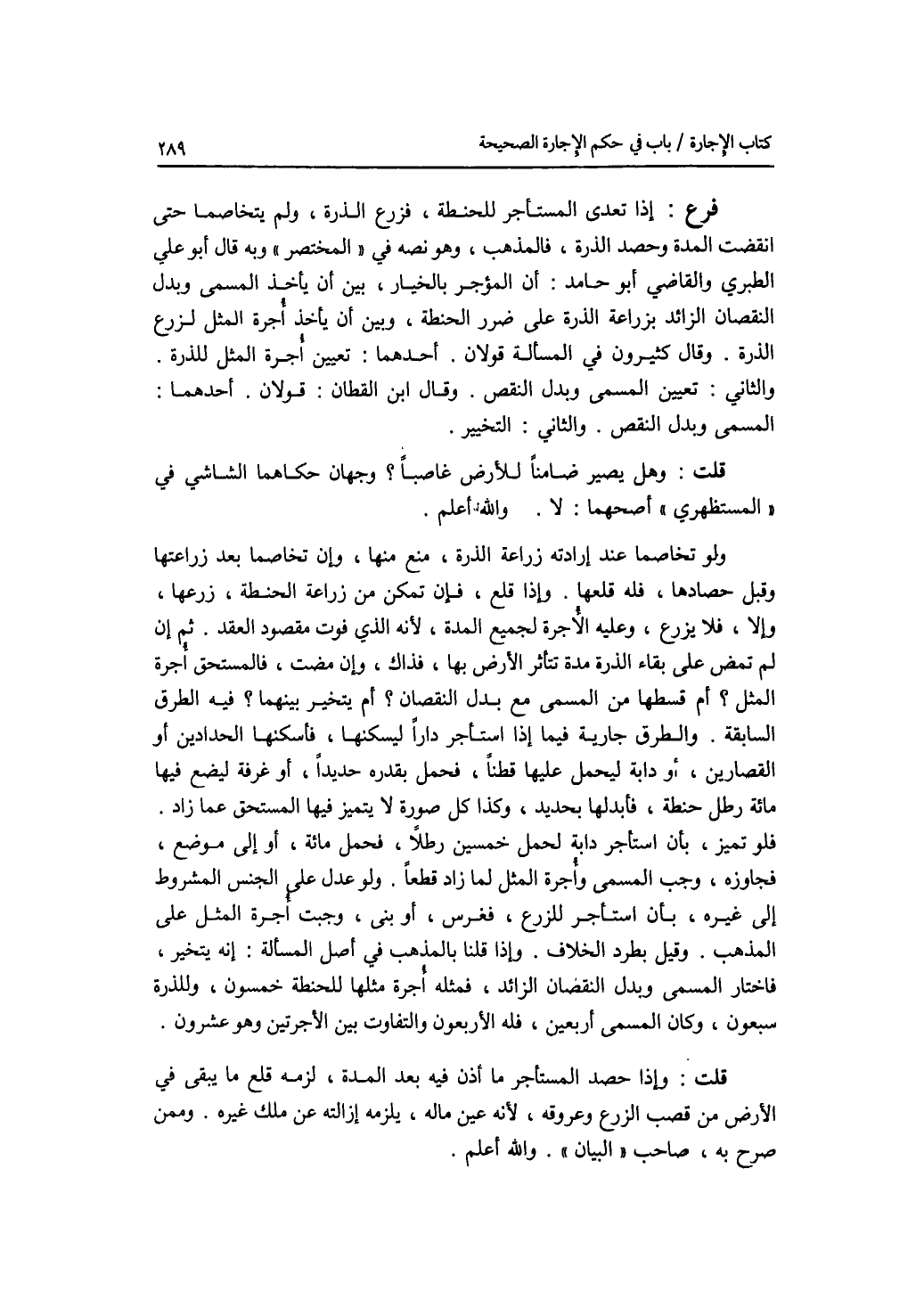 فرع إذا تعدى المستأجر للحنطة، فزرع الذرة، ولم يتخاصما حتى انقضت المدة وحصد الذرة، فالمذهب، وهو نصه في المختصر وبه قال أبو علي الطبري والقاضي أبو حامد: أن المؤجر بالخيار، بين أن يأخذ المسمى وبدل النقصان الزائد بزراعة الذرة ععلى ضرر الحنطة، وبين أن يأخذ أجرة المثل لزرع الذرة. وقال كثيرون: في المسألة قولان. أحدهما: تعيين أجرة المثل للذرة. والثاني: تعيين المسمى وبدل النقص. وقال ابن القطان: قولان. أحدهما: المسمى وبدل النقص. والثاني: التخيير. قلت: وهل يصير ضامنا للارض غاصبا ؟ وجهان حكاهما الشاشي في المستظهري أصحهما: لا. والله أعلم ولو تخاصما عند إرادته زراعة الذرة، منع منها، وإن تخاصما بعد زراعتها وقبل حصادها، فله قلعها. وإذا قلع، فإن تمكن من زراعة الحنطة، زرعها، وإلا، فلا يزرع، وعليه الاجرة لجميع المدة، لانه الذي فوت مقصود العقد. ثم إن لم تمض على بقاء الذرة مدة تتأثر الارض بها، فذاك، وإن مضت، فالمستحق أجرة المثل ؟ أم قسطها من المسمى مع بدل النقصان ؟ أم يتخير بينهما ؟ فيه الطرق السابقة. والطرق جارية فيما إذا استأجر دارا ليسكنها، فأسكنها الحدادين أو القصارين، أو دابة ليحمل عليها قطنا، فحمل بقدره حديدا، أو غرفة ليضع فيها مائة رطل حنطة، فأبدلها بحديد، وكذا كل صورة لا يتميز فيها المستحق عما زاد. فلو تميز، بأن استأجر دابة لحمل خمسين رطلا، فحمل مائة، أو إلى موضع، فجاوزه، وجب المسمى وأجرة المثل لما زاد قطعا. ولو عدل عن الجنس المشروط إلى غيره، بأن استأجر للزرع، فغرس، أو بنى، وجبت أجرة المثل على المذهب. وقيل بطرد الخلاف. وإذا قلنا بالمذهب في أصل المسألة: إنه يتخير، فاختار المسمى وبدل النقصان الزائد، فمثله أجرة مثلها للحنطة خمسون، وللذرة سبعون، وكان المسمى أربعين، فله الاربعون والتفاوت بين الاجرتين وهو عشرون. قلت: وإذا حصد المستأجر ما أذن فيه بعد المدة، لزمه قلع ما يبقى في الارض من قصب الزرع وعروقه، لانه عين ماله، فلزمه إزالته عن ملك غيره. وممن صرح به، صاحب البيان. والله أعلم