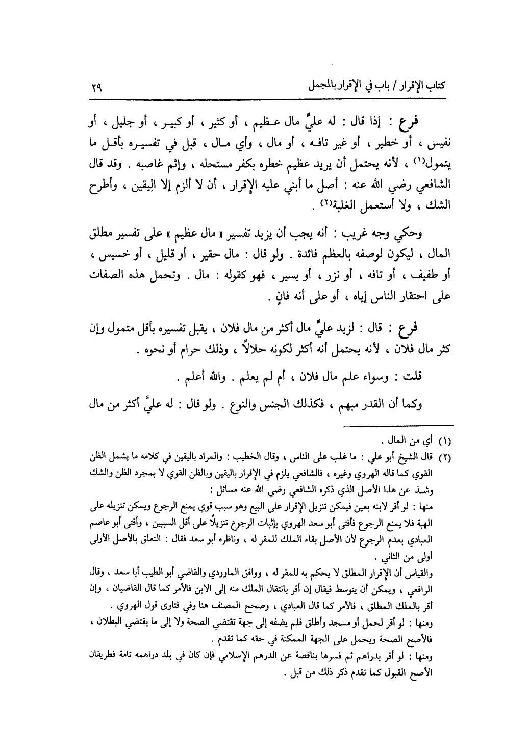 فرع إذا قال: له علي مال عظيم، أو كثير، أو كبير، أو جليل، أو نفيس، أو خطير، أو غير تافه، أو مال، وأي مال، قبل في تفسيره بأقل ما يتمول، لانه يحتمل أن يريد عظيم خطره بكفر مستحله، وإثم غاصبه وقد قال الشافعي رضي الله عنه: أصل ما أبني عليه الاقرار، أن لا ألزم إلا اليقين، وأطرح الشك، ولا أستعمل الغلبة. وحكي وجه غريب: أنه يجب أن يزيد تفسير مال عظيم على تفسير سمطلق المال، ليكون لوصفه بالعظم فائدة. ولو قال: مال حقير، أو قليل، أو خسيس، أو طفيف، أو تافه، أو نزر، أو يسير، فهو كقوله: مال. وتحمل هذه الصفات على احتقار الناس إياه، أو على أنه فان. فرع قال: لزيد علي مال أكثر من مال فلان، يقبل تفسيره بأقل متمول وإن كثر مال فلان، لانه يحتمل أنه أكثر لكونه حلالا، وذلك حرام أو نحوه. قلت: وسواء علم مال فلان، أم لم يعلم. والله أعلم. وكما أن القدر مبهم، فكذلك الجنس والنوع. ولو قال: له علي من الذهب أكثر من مال
