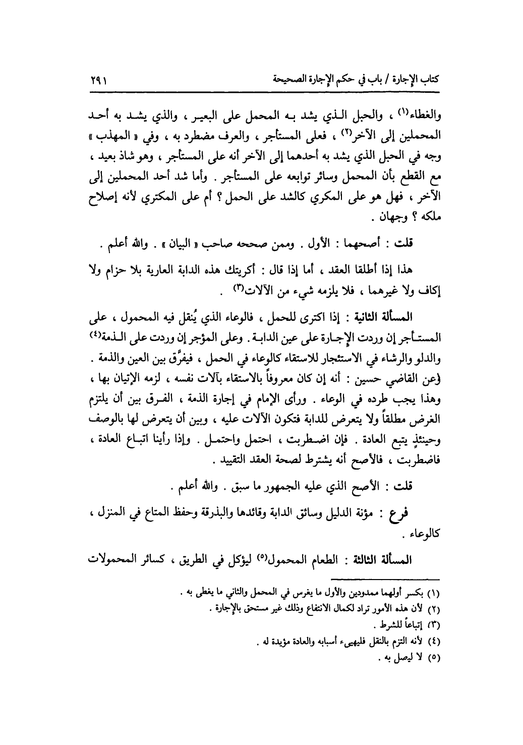 والغطاء، والحبل الذي يشد به المحمل على البعير، والذي يشد به أحد المحملين إلى الآخر، (فعلى المستأجر، والعرف مضطرد به، وفي المهذب وجه في الحبل الذي يشد به أحدهما إلى الآخر أنه على المستأجر، وهو شاذ بعيد، مع القطع بأن المحمل وسائر توابعه على المستأجر. وأما شد أحد المحملين إلى الآخر)، فهل هو على المكري كالشد على الحمل ؟ أم على المكتري لانه إصلاح ملكه ؟ وجهان. قلت: أصحهما: الاول. وممن صححه صاحب البيان. والله أعلم هذا إذا أطلقا العقد، أما إذا قال: أكريتك هذه الدابة العارية بلا حزام ولا إكاف ولا غيرهما، فلا يلزمه شئ من الآلات. المسألة الثانية: إذا اكترى للحمل، فالوعاء الذي ينقل فيه المحمول، عل المستأجر إن وردت الاجارة على عين الدابة. وعلى المؤجر إن ورث على الذمة. والدلو والرشاء في الاستئجار للاستقاء كالوعاء في الحمل، فيفرق بين العين والذمة. وعن القاضي حسين: أنه إن كان معروفا بالاستقاء بآلات نفسه، لزمه الاتيان بها، وهذا يجب طرده في الوعاء. ورأى الامام في إجارة الذمة، الفرق بين أن يلتزم الغرض مطلقا ولا يتعرض للدابة فتكون الآلات عليه، وبين أن يتعرض لها بالوصف وحينئذ يتبع العادة. فإن اضطربت، احتمل واحتمل. وإذا رأينا اتباع العادة، فاضطربت، فالاصح أنه يشترط لصحة العقد التقييد. قلت: الاصح الذي عليه الجمهور ما سبق. والله أعلم فرع مؤنة الدليل وسائق الدابة وقائدها والبذرقة وحفظ المتاع في المنزل، كالوعاء. المسألة الثالثة: الطعام المحمول ليؤكل في الطريق، كسائر المحمولات