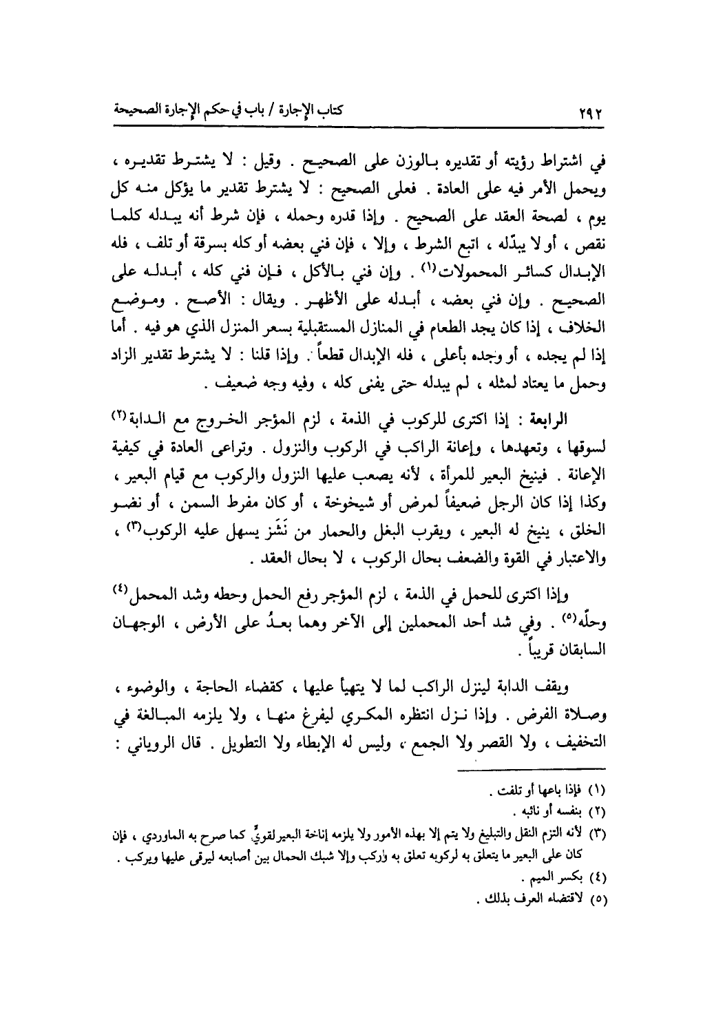 في اشتراط رؤيته أو تقديره بالوزن على الصحيح. وقيل: لا يشترط تقديره، ويحمل الامر فيه على العادة. فعلى الصحيح: لا يشترط تقدير ما يؤكل منه كل يوم، لصحة العقد على الصحيح. وإذا قدره وحمله، فإن شرط أنه يبدله كلما نقص، أو لا يبدله، اتبع الشرط، وإلا، فإن فني بعضه أو كله بسرقة أو تلف، فله الابدال كسائر المحمولات. وإن فني بالاكل، فإن فني كله، أبدله على الصحيح. وإن فني بعضه، أبدله على الاظهر. ويقال: الاصح. وموضع الخلاف، إذا كان يجد الطعام في المنازل المستقبلة بسعر المنزل الذي هو فيه. أما إذا لم يجده، أو وجده بأعلى، فله الابدال قطعا. وإذا قلنا: لا يشترط تقدير الزاد وحمل ما يعتاد لمثله، لم يبدله حتى يفنى كله، وفيه وجه ضعيف. الرابعة: إذا اكترى للركوب في الذمة، لزم المؤجر الخروج مع الدابة لسوقها، وتعهدها، وإعانة الراكب فق الركوب والنزول. وتراعى العادة في كيفية الاعانة. فينيخ البعير للمرأة، لانه يصعب عليها النزول والركوب مع قيام البعير، وكذا إذا كان الرجل ضعيفا لمرض أو شيخوخة، أو كان مفرط السمن، أو نضو الخلق، ينيخ له البعير، ويقرب البغل والحمار من نشز يسهل عليه الركوب، والاعتبار في القوة والضعف بحال الركوب، لا بحال العقد. وإذا اكترى للحمل في الذمة، لزم المؤجر رفع الحمل وحطه وشد المحمل وحله. وفي شد أحد المحملين إلى الآخر وهما بعد على الارض، الوجهان السابقان قريبا. ويقف الدابة لينزل الراكب لما لا يتهيأ عليها، كقضاء الحاجة، والوضوء، وصلاة الفرض. وإذا نزل انتظره المكري ليفرغ منها، ولا يلزمه المبالغة في التخفيف، ولا القصر ولا الجمع، وليس له الابطاء ولا التطويل. قال الروياني: