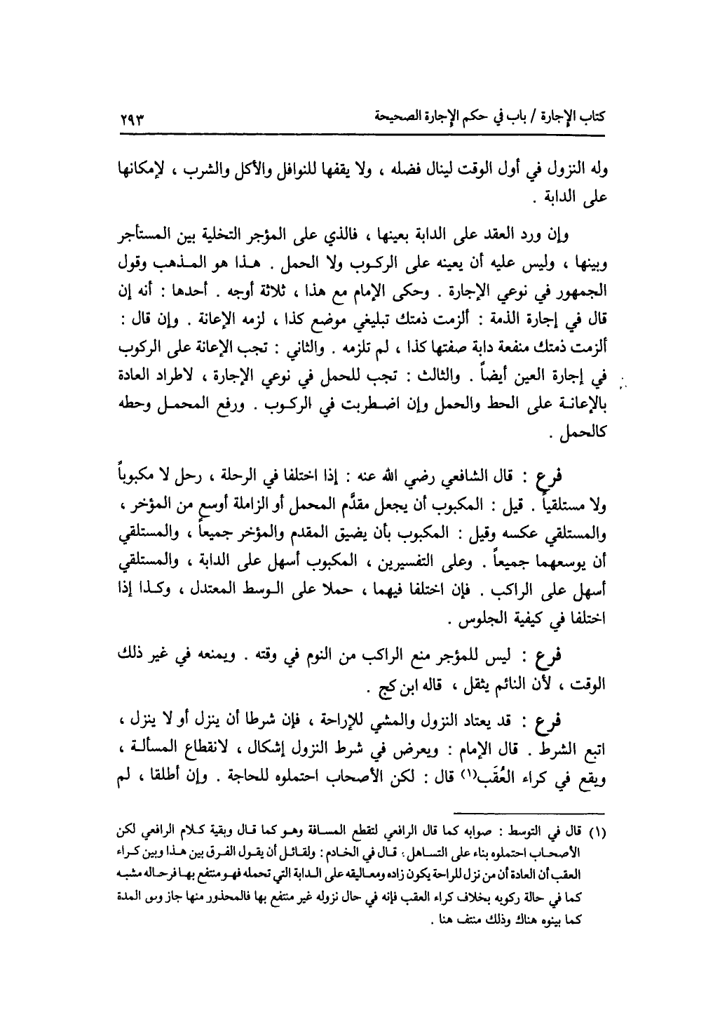 وله النزول في أول الوقت لينال فضله، ولا يقفها للنوافل والاكل والشرب، لامكانها على الدابة. وإن ورد العقد على دابة بعينها، فالذي على المؤجر التخلية بين المستأجر وبينها، وليس عليه أن يعينه على الركوب ولا الحمل. هذا هو المذهب وقول الجمهور في نوعي الاجارة. وحكى الامام مع هذا، ثلاثة أوجه. أحدها: أنه إن قال في إجارة الذمة: ألزمت ذمتك تبليغي موضع كذا، لزمه الاعانة. وإن قال: ألزمت ذمتك منفعة دابة صفتها كذا، لم تلزمه. والثاني: تجب الاعانة على الركوب في إجارة العين أيضا. والثالث: تجب للحمل في نوعي الاجارة، لاطراد العادة بالاعانة على الحط والحمل وإن اضطربت في الركوب. ورفع المحمل وحطه كالحمل. فرع قال الشافعي رضي الله عنه: إذا اختلفا في الرحلة، هل لا مكبوبا ولا مستلقيا. قيل: المكبوب أن يجعل مقدم المحمل أو الزاملة أوسع من المؤجر، والمستلقي عكسه. وقيل: المكبوب بأن يضيق المقدم والمؤخر جميعا، والمستلقي أن يوسعهما جميعا. وعلى التفسيرين، المكبوب أسهل على الدابة، والمستلقي أسهل على الراكب. فإن اختلفا فيهما، حملا على الوسط المعتدل، وكذا إذا اختلفا في كيفية الجلوس. فرع ليس للمؤجر منع الراكب من النوم في وقته. ويمنعه في غير ذلك الوقت، لان النائم يتقل، قاله ابن كج. فرع قد يعتاد النزول والمشي للاراحة، فإن شرطا أن ينزل أو لا ينزل، اتبع الشرط. قال الامام: ويعرض في شرط النزول إشكال، لانقطاع المسابة، ويقع في كراء العقب. قال: لكن الاصحاب احتملوه للحاجة. وإن أطلقا، لم