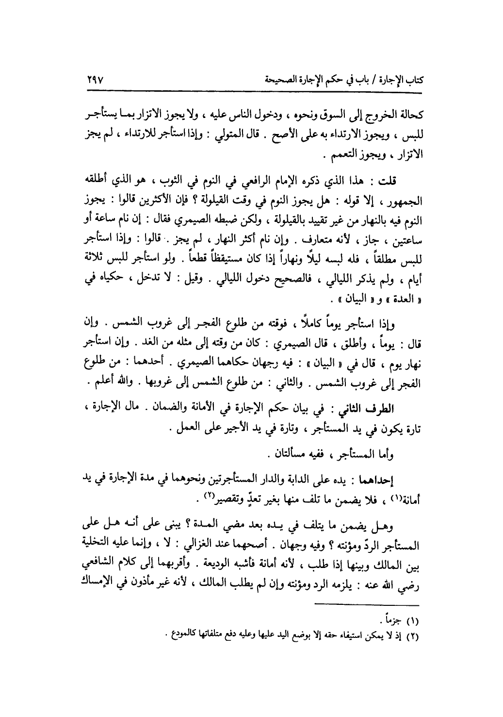 كحالة الخروج إلى السوق ونحوه، ودخول الناس عليه، ولا يجوز الاتزار بما يستأجر للبس، ويجوز الارتداء به على الاصح. قال المتولي: وإذا استأجر للارتداء، لم يجز الاتزار، ويجوز التعمم. قلت: هذا الذي ذكره الامام الرافعي في النوم في الثوب، هو الذي اطلقه الجمهور، إلا قوله: هل يجوز النوم في وقت القيلولة ؟ فإن الاكثرين قالوا: يجوز النوم فيه بالنهار من غير تقييد بالقيلولة، ولكن ضبطه الصيمري فقال: إن نام ساعة أو ساعتين، جاز، لانه متعار ف. وإن نام أكثر النهار، لم يجز. قالوا: وإذا استأجر للبس مطلقا، فله لبسه ليلا ونهارا إذا كان مستيقظا قطعا. ولو استأجر للبس ثلاثة أيام، ولم يذكر الليالي، فالصحيح دخول الليالي. وقيل: لا تدخل، حكياه في العدة والبيان. وإذا استأجر يوما كاملا، فوقته من طلوع الفجر إلى غروب الشمس. وإن قال: يوما، وأطلق، قال الصيمري: كان من وقته إلى مثله من الغد. وإن استأجر نهار يوم، قال في البيان: فيه وجهان حكاهما الصيمري. أحدهما: من طلوع الفجر إلى غروب الشمس. والثاني: من طلوع الشمس إلى غروبها. والله أعلم الطرف الثاني: في بيان حكم الاجارة في الامانة والضمان. مال الاجارة، تارة يكون في يد المستأجر، وتارة في يد الاجير على العمل. وأما المستأجر، ففيه مسألتان. إحداهما: يده على الدابة والدار المستأجرتين ونحوهما في مدة الاجارة يد أمانة، فلا يضمن ما تلف منها بغير تعد وتقصير وهل يضمن ما يتلف في يده بعد مضي المدة ؟ يبنى على أنه هل على المستأجر الرد ومؤنته ؟ وفيه وجهان. أصحهما عند الغزالي: لا، وإنما عليه التخلية بين المالك وبينها إذا طلب، لانه أمانة فأشبه الوديعة. وأقربهما إلى كلام الشافعي رضي الله عنه: يلزمه الرد ومؤنته وإن لم يطلب المالك، لانه غير مأذون في الامساك