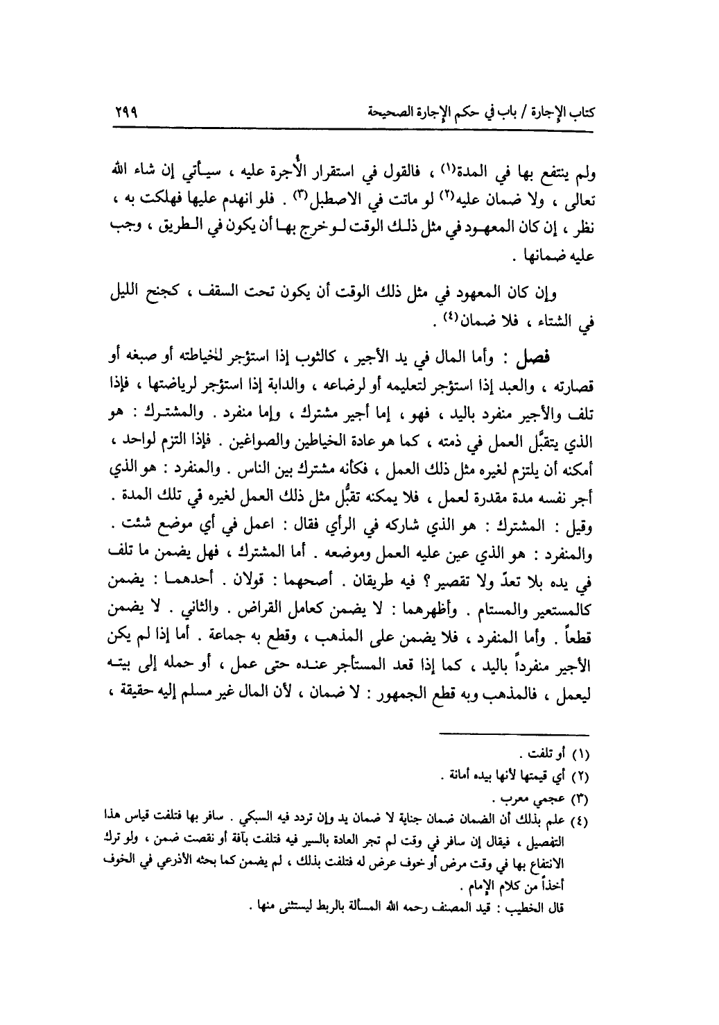 ولم ينتفع بها في المدة، فالقول في استقرار الاجرة عليه، سيأتي إن شاء الله تعالى، ولا ضمان عليه لو ماتت في الاصطبل. فلو انهدم عليها فهلكت به، نظر، إن كان المعهود في مثل ذلك الوقت لو خرج بها أن يكون في الطريق، وجب عليه ضمانها. وإن كان المعهود في مثل ذلك الوقت أن يكون تحت السقف، كجنح الليل في الشتاء، فلا ضمان. فصل وأما المال في يد الاجير، كالثوب إذا استؤجر لخياطته أو صبغه أو قصارته، والعبد إذا استؤجر لتعليمه أو لرضاعه، والدابة إذا استؤجر لرياضتها. فإذا تلف والاجير منفرد باليد، فهو، إما أجير مشترك، وإما منفرد. والمشترك: هو الذي يتقبل العمل في ذمته، كما هو عادة الخياطين والصواغين. فإذا التزم لواحد، أمكنه أن يلتزم لغيره مثل ذلك العمل، فكأنه مشترك بين الناس. والمنفرد: هو الذي أجر نفسه مدة مقدرة لعمل، فلا يمكنه تقبل مثل ذلك العمل لغيره في تلك المدة. وقيل: المشترك: هو الذي شاركه في الرأي فقال: اعمل في أي موضع شئت. والمنفرد: هو الذي عين عليه العمل وموضعه. أما المشترك، فهل يضمن ما تلف في يده بلا تعد ولا تقصير ؟ فيه طريقان. أصحهما: قولان. أحدهما: يضمن كالمستعير والمستام. وأظهرهما: لا يضمن كعامل القراض. والثاني: لا يضمن قطعا. وأما المنفرد، فلا يضمن على المذهب، وقطع به جماعة. أما إذا لم يكن الاجير منفردا باليد، كما إذا قعد المستأجر عنده حتى عمل، أو حمله إلى بيته ليعمل، فالمذهب وبه قطع الجمهور: لا ضمان، لان المال غير مسلم إليه حقيقة،