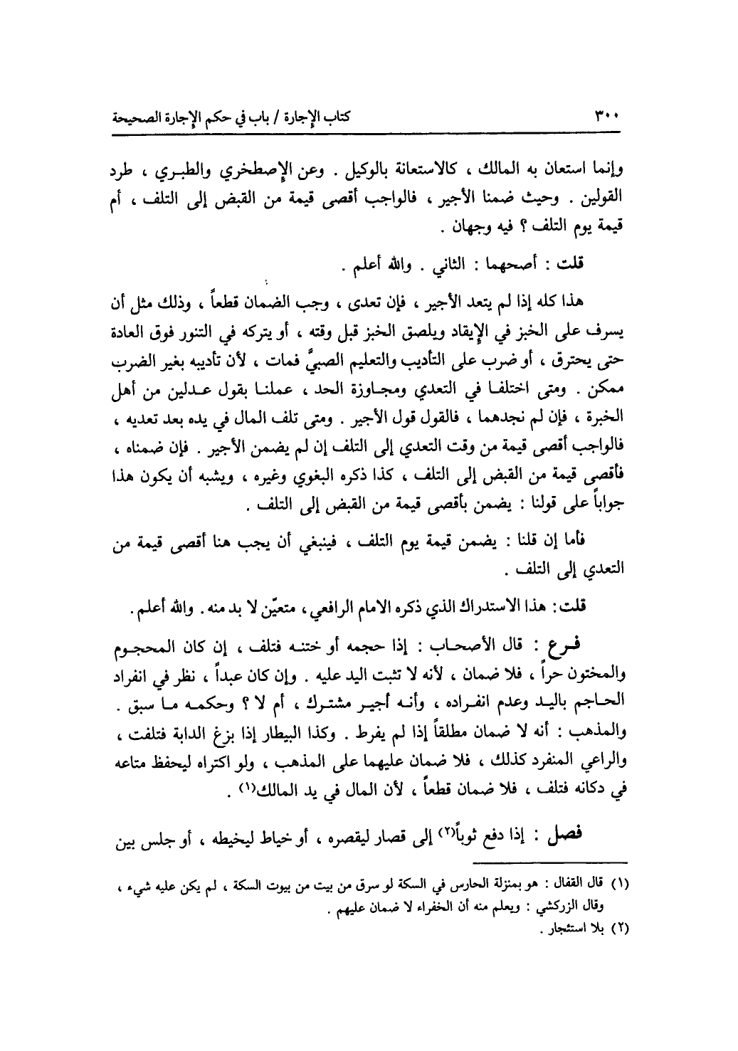 وإنما استعان به المالك، كالاستعانة بالوكيل. وعن الاصطخري والطبري، طرد القولين. وحيث ضمنا الاجير، فالواجب أقصى قيمة من القبض إلى التلف، أم قيمة يوم التلف ؟ فيه وجهان. قلت: أصحهما: الثاني. والله أعلم هذا كله إذا لم يتعد الاجير، فإن تعدى، وجب الضمان قطعا، وذلك مثل أن يسرف على الخبز في الايقاد ويلصق الخبز قبل وقته، أو يتركه في التنور فوق العادة حتى يحترق، أو ضرب على التأديب والتعليم الصبي فمات، لان تأديبه بغير الضرب ممكن. ومتى اختلفا في التعدي ومجاوزة الحد، عملنا بقول عدلين من أهل الخبرة، فإن لم نجدهما، فالقول قول الاجير. ومتى تلف المال في يده بعد تعديه، فالواجب أقصى قيمة من وقت التعدي إلى التلف إن لم يضمن الاجير. فإن ضمناه، فأقصى قيمة من القبض إلى التلف، كذا ذكره البغوي وغيره. ويشبه أن يكون هذا جوابا على قولنا: يضمن بأقصى قيمة من القبض إلى التلف. فأما إن قلنا: يضمن قيمة يوم التلف، فينبغي أن يجب هنا أقصى قيمة من التعدي إلى التلف. قلت: هذا الاستدراك الذي ذكره الامام الرافعي، متعين لا بد منه. والله أعلم فرع قال الاصحاب: إذا حجمه أو ختنه فتلف، إن كان المحجوم والمختون حرا، فلا ضمان، لانه لا تثبت اليد عليه. وإن كان عبدا، نظر في انفراد الحاجم باليد وعدم انفراده، وأنه أجير مشترك، أم لا ؟ وحكمه ما سبق. والمذهب: أنه لا ضمان مطلقا إذا لم يفرط. وكذا البيطار إذا بزغ الدابة فتلفت، والراعي المنفرد كذلك، فلا ضمان عليهما على المذهب، ولو اكتراه ليحفظ متاعه في دكانه فتلف، فلا ضمان (قطعا)، لان المال في يد المالك. فصل إذا دفع ثوبا إلى قصار ليقصره، أو خياط ليخيطه، أو جلس بين